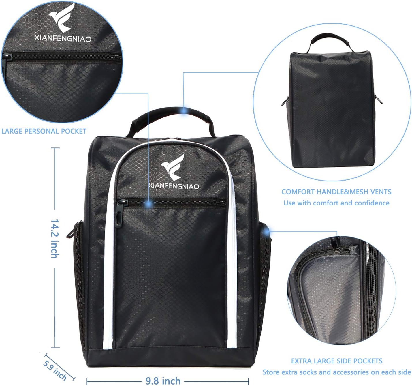 3 External Pockets:This sport shoes bag Comes with an easy-glide zipper for ease of getting your shoes in and out.The front pocket place phones, golf gloves, or personal items.Side pockets on either side can be used to store accessories, such as golf balls, tees, socks, keys, etc.