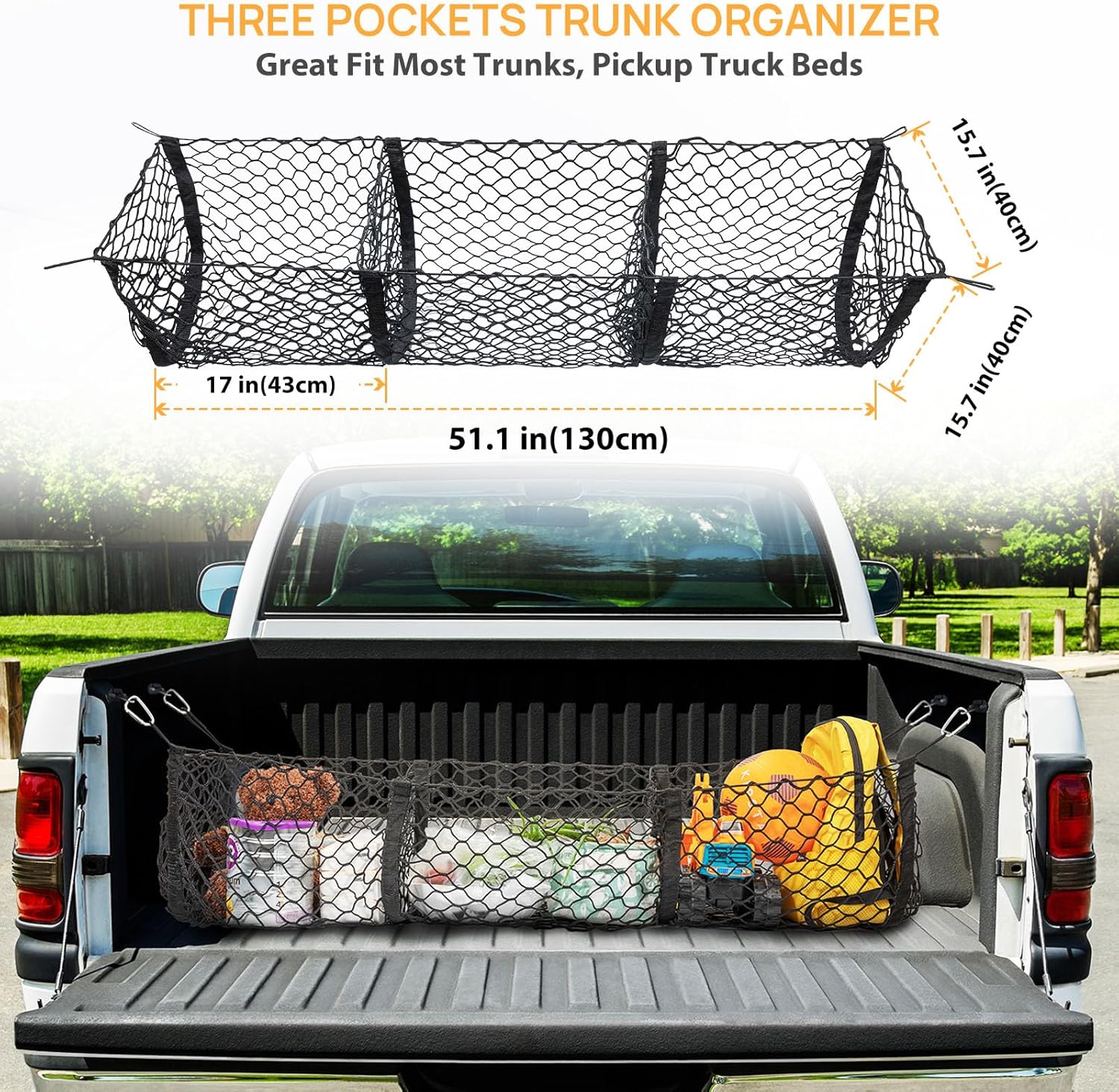 ✔【Fits Most Vehicles】The trunk storage net measures 51.1×15.7 inch.It can be used as Truck Cargo Net,Car Cargo Net,Organize Bed Net.And it fits most truck models such as Ford/Dodge/Chevy Silverado/GMC/Toyota/Nissan/Honda/Lincoln ect.Make you organize your truck easily.Ideal for storing camping gear, fishing tackle,work tools,coolers,picnic equipment,outdoor items;this bungee cargo net suits all shapes and sizes