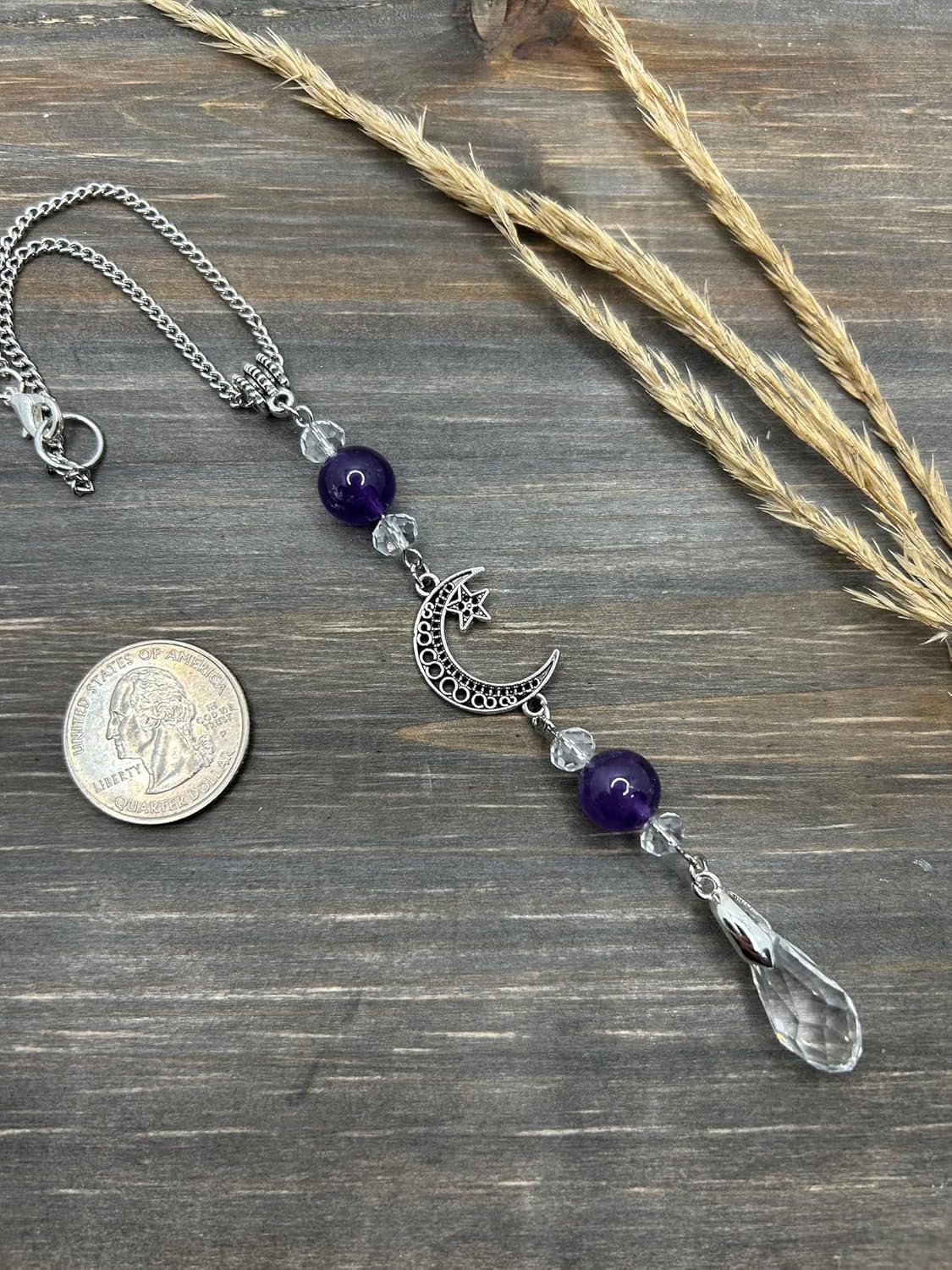 Decorate your car with our rearview mirror semi-precious Amethyst Stone Moon and Star Sun Catcher BOHO Rearview Mirror Car Charm!