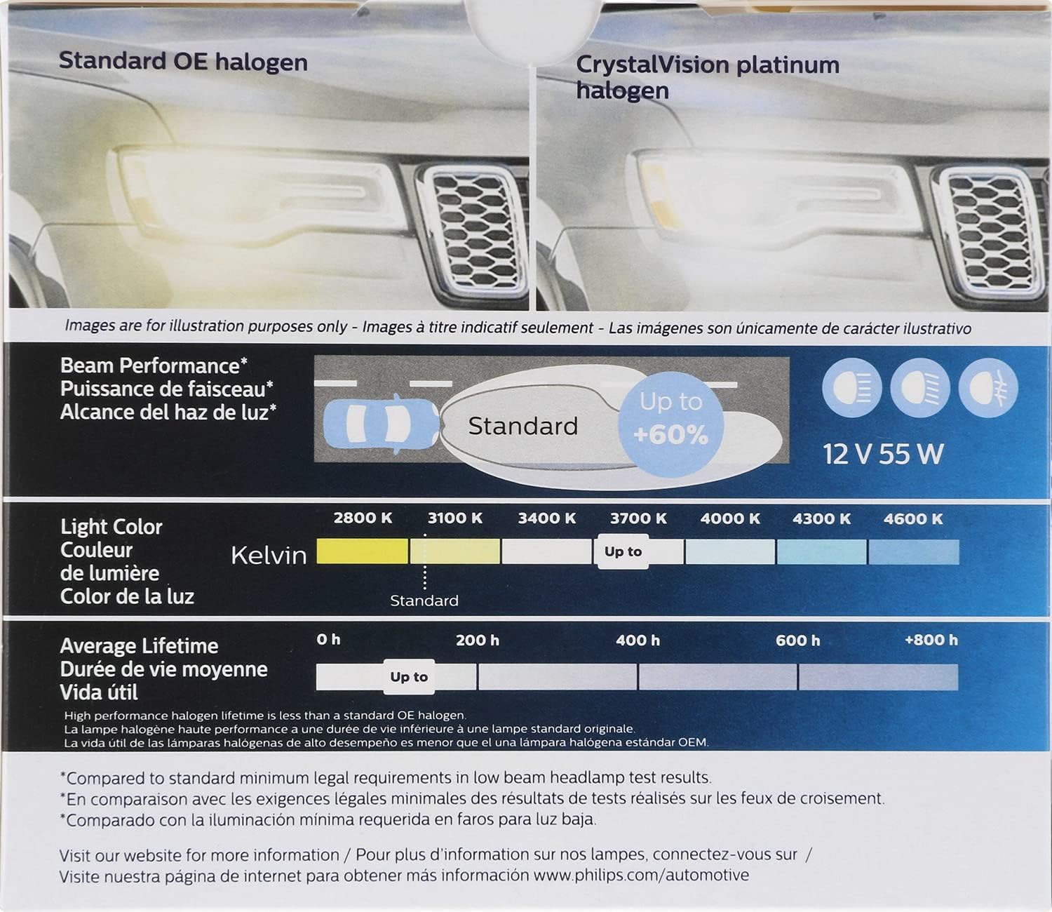 Philips CrystalVision platinum upgrade headlight bulbs deliver a sharp, irresistble look. Ultra-white gradient coating that creates up to 4000K brilliant white light, and produces up to 60% more vision compared to standard halogen bulb. The perfect choice for those who want to drive with style, without compromising on safety.