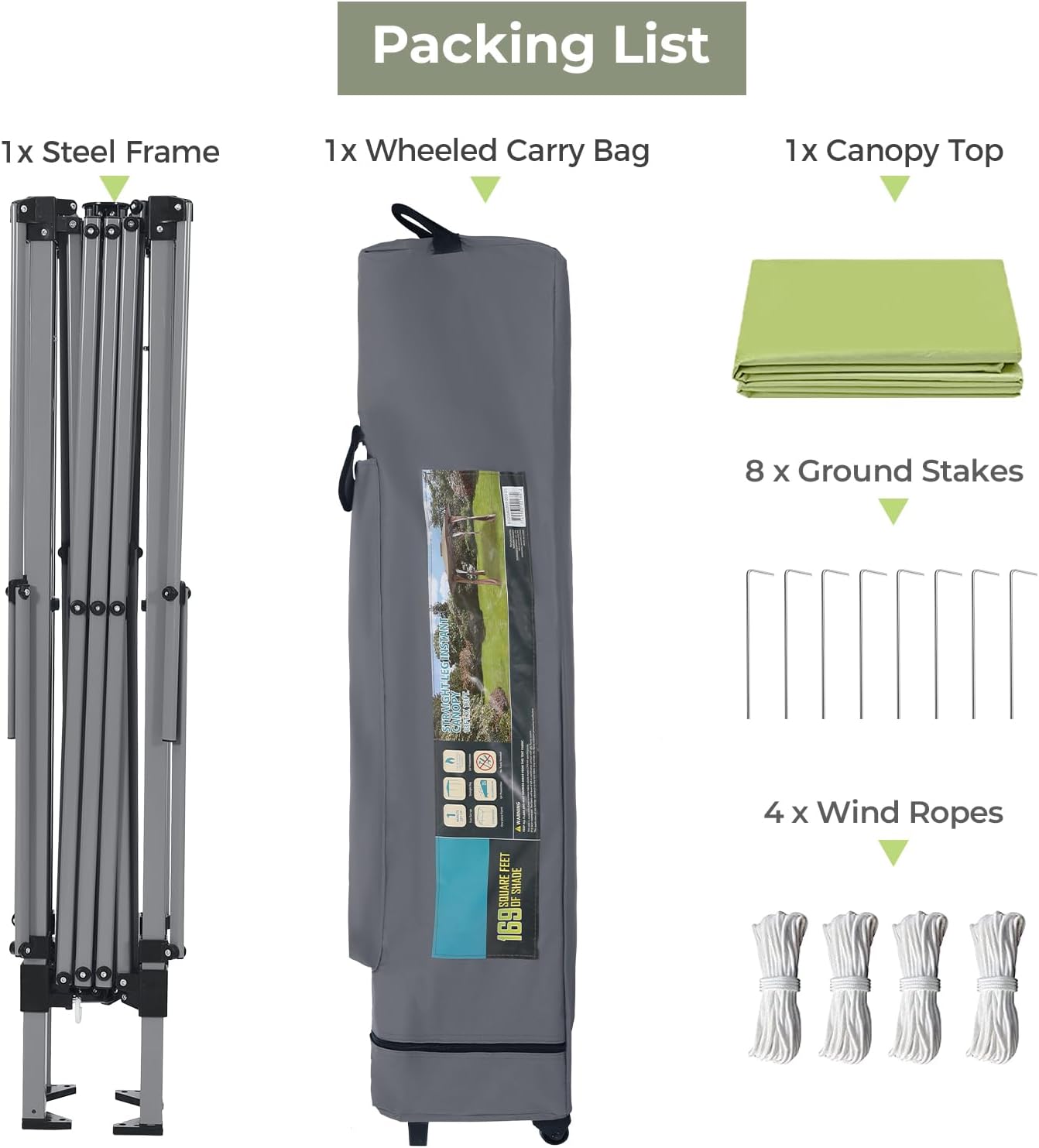 PACKAGE LIST: 1x canopy frame + 1x canopy top + 1x wheeled bag + 4x wind ropes +8x ground stakes. Note: During strong winds or heavy rain, be sure to retract the canopy to avoid damage. If you have any questions about the product, please feel free to contact us, we will help you within 24 hours.