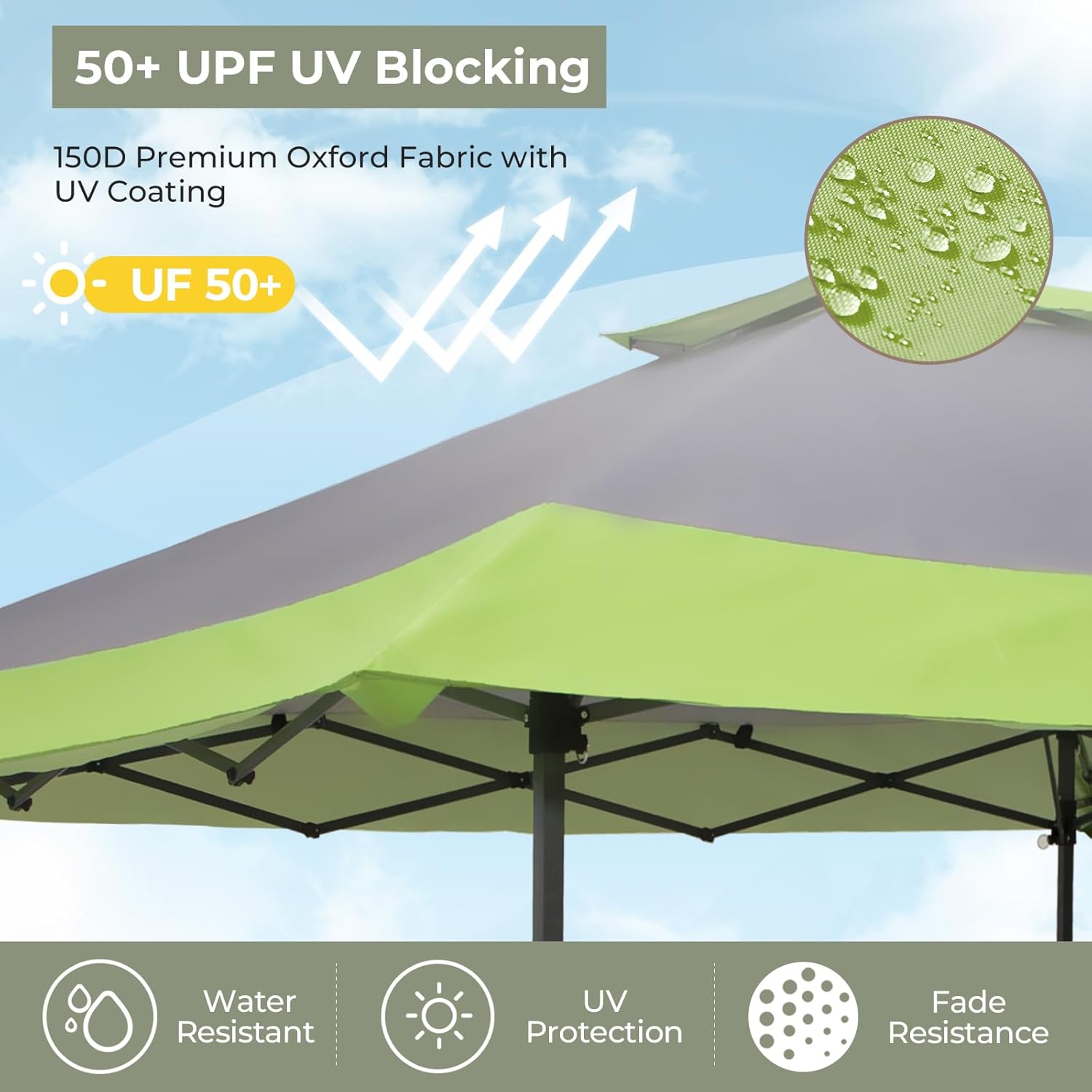 99% UV PROTECTION & VENTED TOP DESIGN: Outdoor canopies top are made of high-quality and durable 150D silver-coated oxford fabrics, which can block 99% of UV rays and are waterproof. Unique vented top design can promote the flow of air inside and outside the canopy, making you cooler and more comfortable in hot summer. At the same time,improves the stability of the entire canopy.