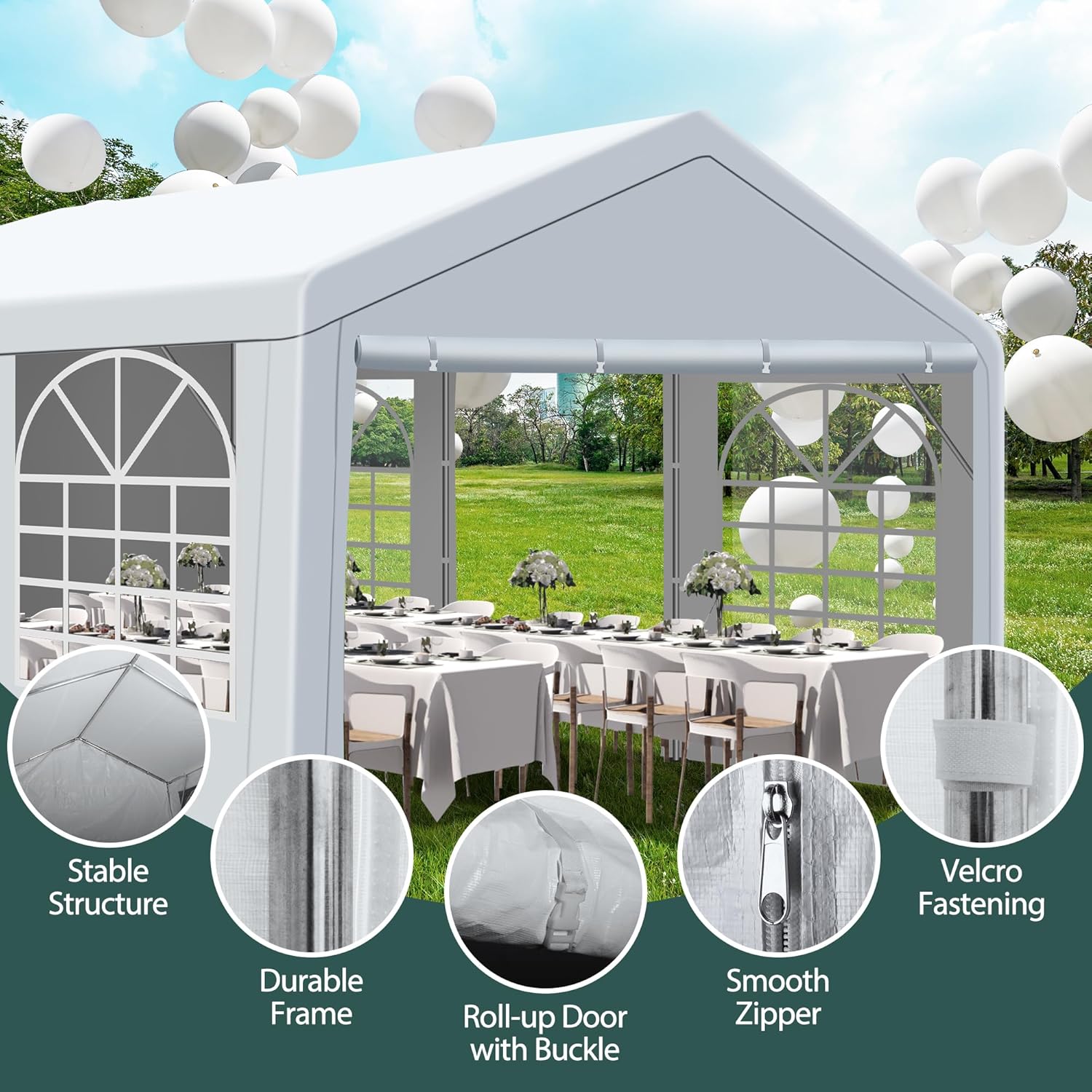 【MULTIPLE SIZES】: Our party tent are available in a variety of sizes for you to choose from, which can accommodate up to 30-40 people for dining or partying at the same time, and are suitable for weddings, parties, playgrounds, patios, garages, beaches, farms, barbecues, trade shows, sporting events and other scenarios. Perfectly suited to your different needs.