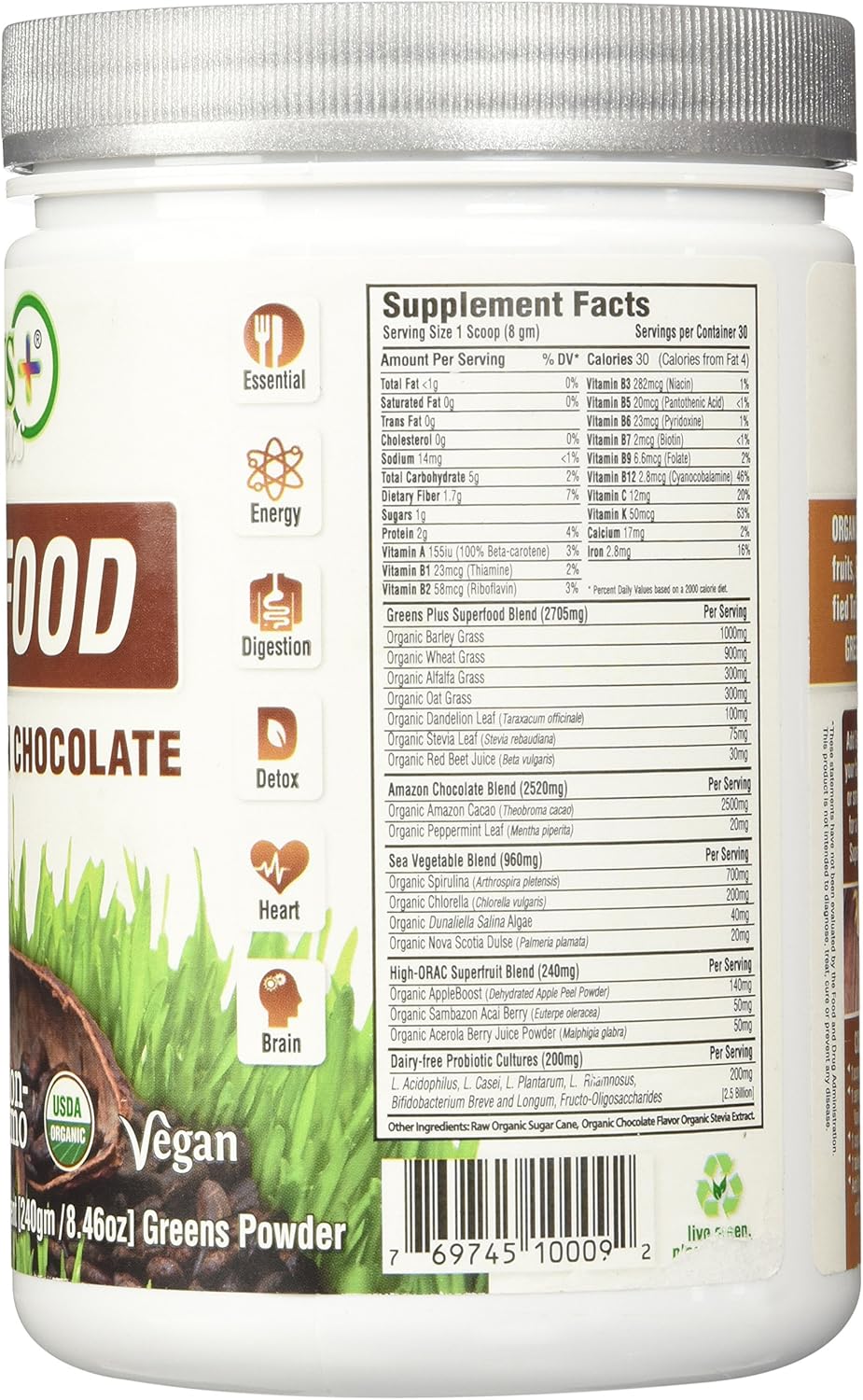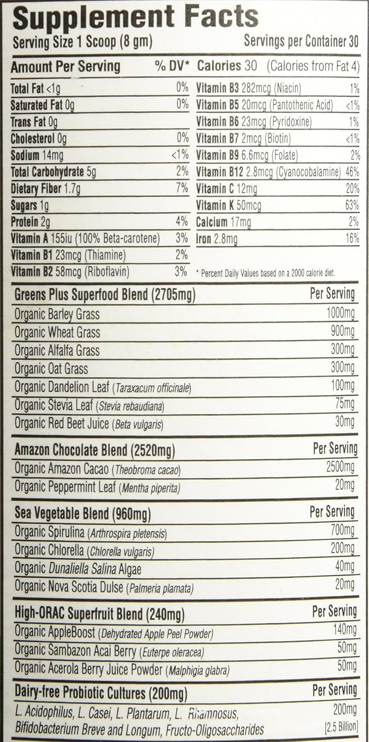 Amazon Chocolate USDA Certified Organic Blend Green Foods, Superfruits, Sea Vegetables and Probiotics Loaded with Antioxidant-rich Amazonia Cocoa Bean Powder Free of common allergens: gluten, dairy and soy