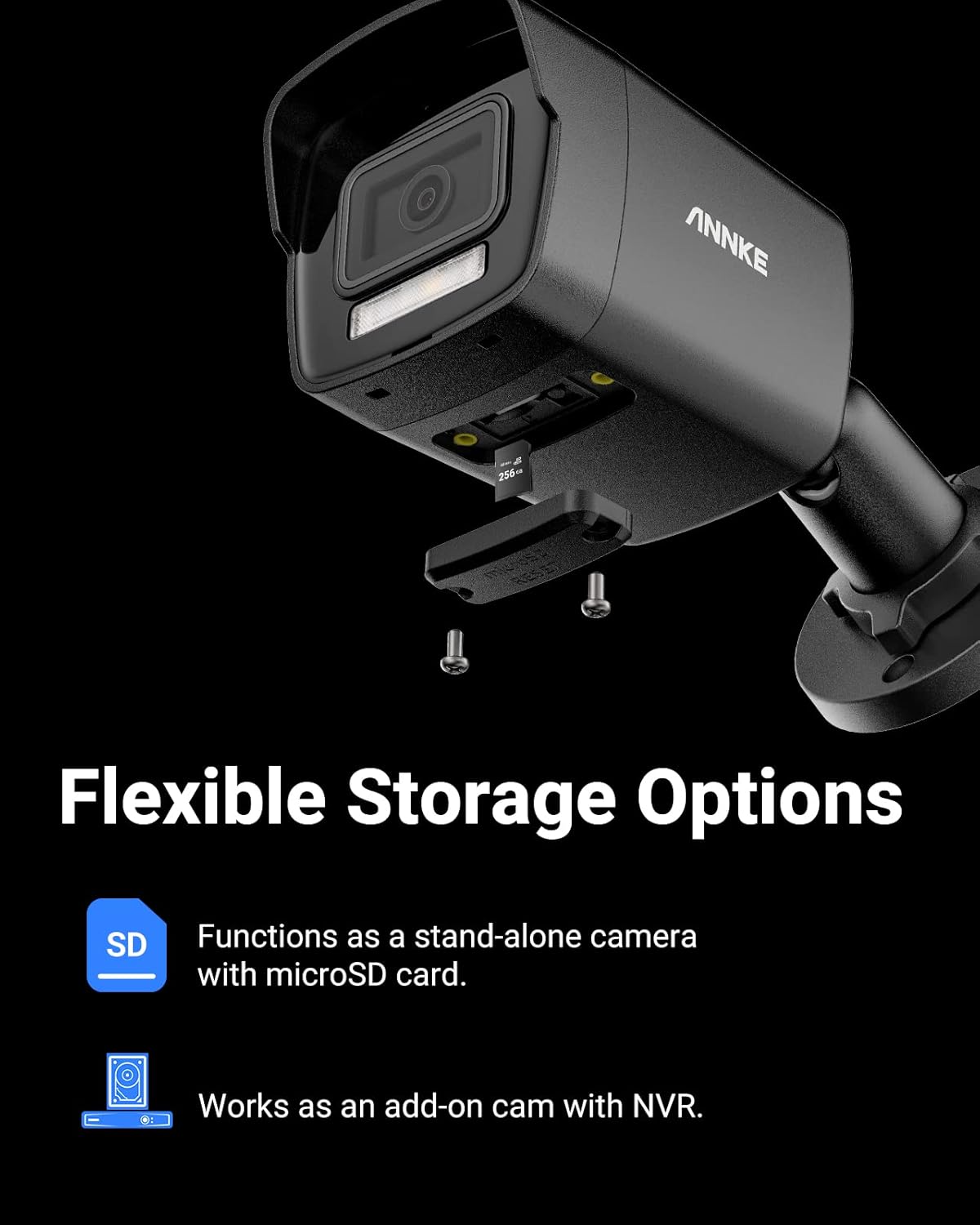 【Built-in microSD Slot for Separate Use 】3K PoE camera can connect a NVR system to use. Or insert a SD card for separate use as there’s a built-in microSD slot designed. Support on-board storage up to 256 GB (SD card not included). One camera two ways of use.