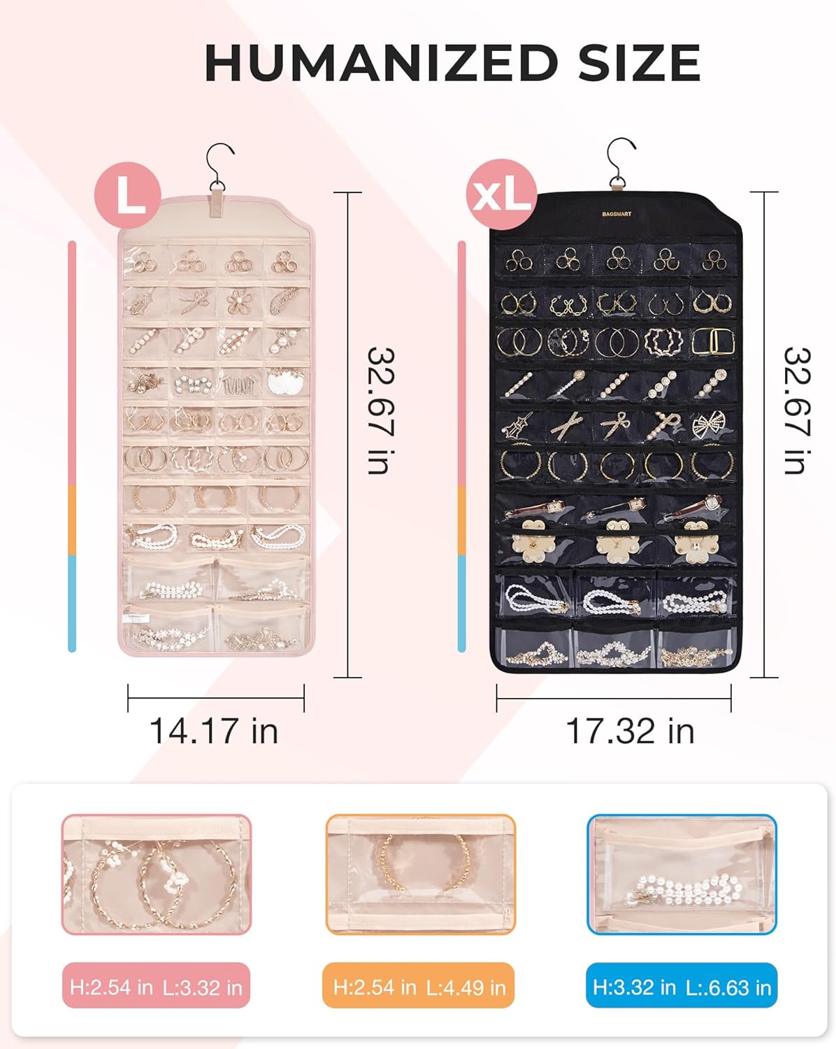 Ultimate Convenience: Experience easy access to your jewelry with the 360° rotating hook of the BAGSMART jewelry organizer. Each pocket of hanging jewelry organizer for closet with clear PVC-designed pockets allows for quick retrieval of your desired accessories, saving you time and effort.