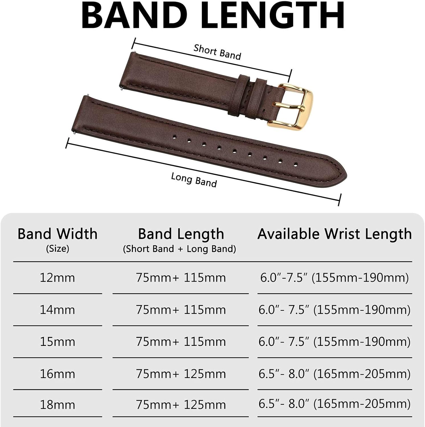 12mm watch strap with 10mm buckle; 14mm watch strap with 12mm buckle;15mm watch strap with 14mm buckle; 16mm watch strap with 14mm buckle; 18mm watch strap with 16mm buckle; 20mm watch strap with 18mm buckle.