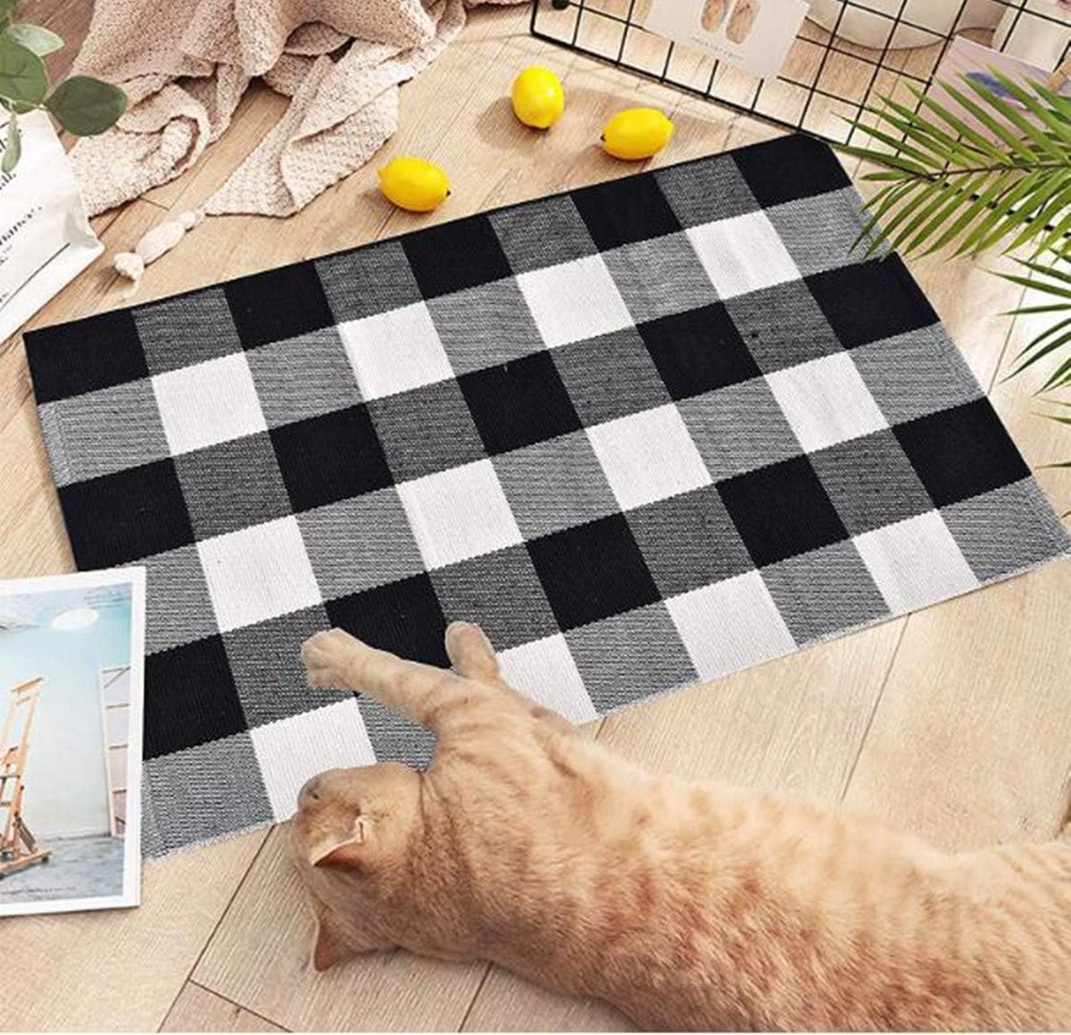 1. buffalo plaid rug MATERIALS: Our buffalo plaid checkered doormat is made with 45% cotton, 45% polyester, and 10% viscose fiber. Size: 23.6”x35.4”, this buffalo check rug 1~2 cm deviation is allowed due to hand-cutting and sewing.