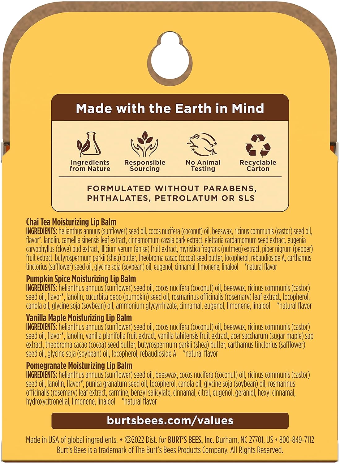 Burts Bees 100% Natural Moisturizing Lip Balm, Winter Variety Pack, Chai Tea, Pumpkin Spice, Vanilla Maple, Pomegranate, 4 Tubes of Lip Balm, 0.15 Ounce (Pack of 4)