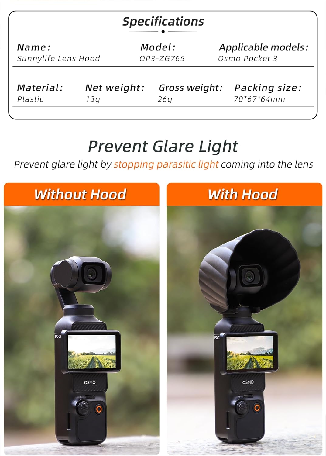 【Lens hood for DJI Osmo Poacket 3】Prevent Glare Light for DJI Osmo Poacket 3,finely crafted, with good texture and durability.Effectively block the strong light on both sides of the screen and the top of the screen, shooting in a strong light environment can enhance the screen visibility;