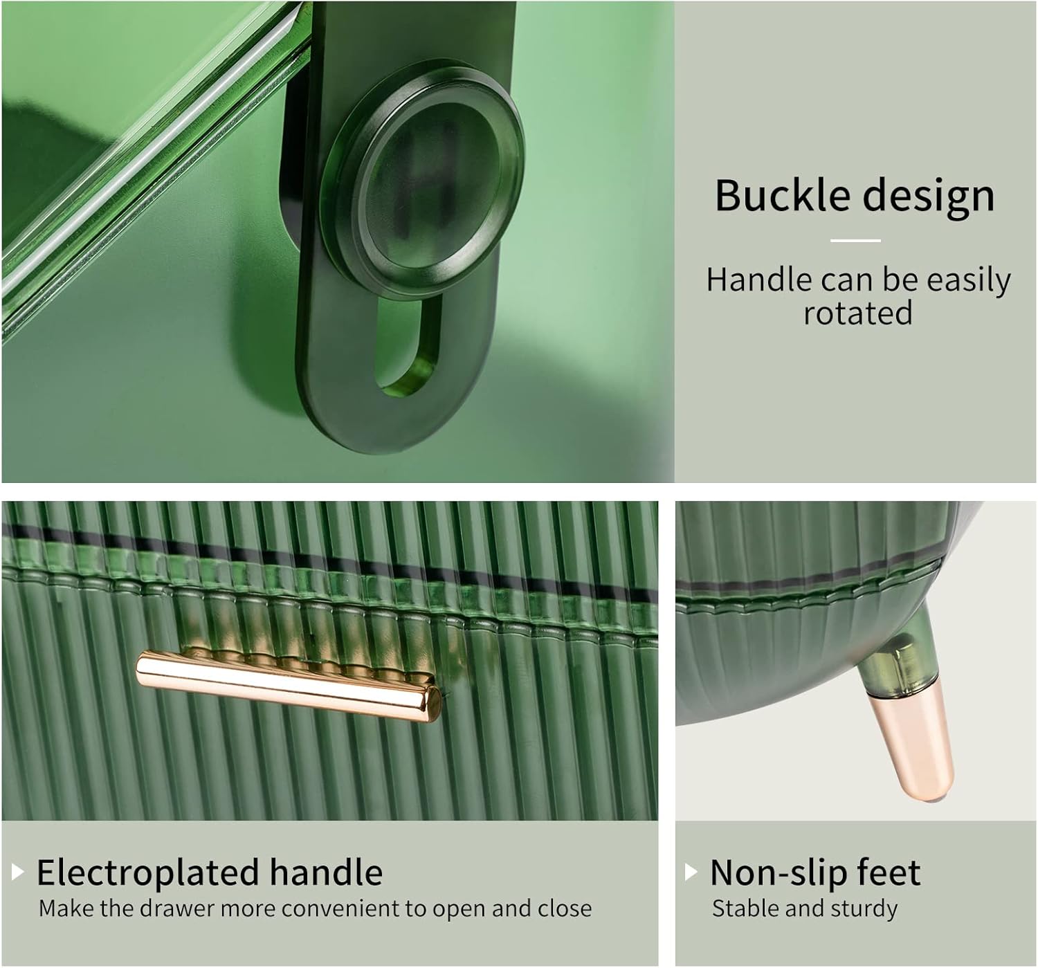 【Product Size】: Makeup organizer: 11.4×8.1×14.4inches, Makeup brush organizer: 3.5×3.5×8.2inches. Cosmetic display case with the unique color is an elegant presence. Pale green appearance with delicate electroplated handle and non-slip feet, all of it reflects its elegance and suits the decorative of any room, making it the great organizer worth having.