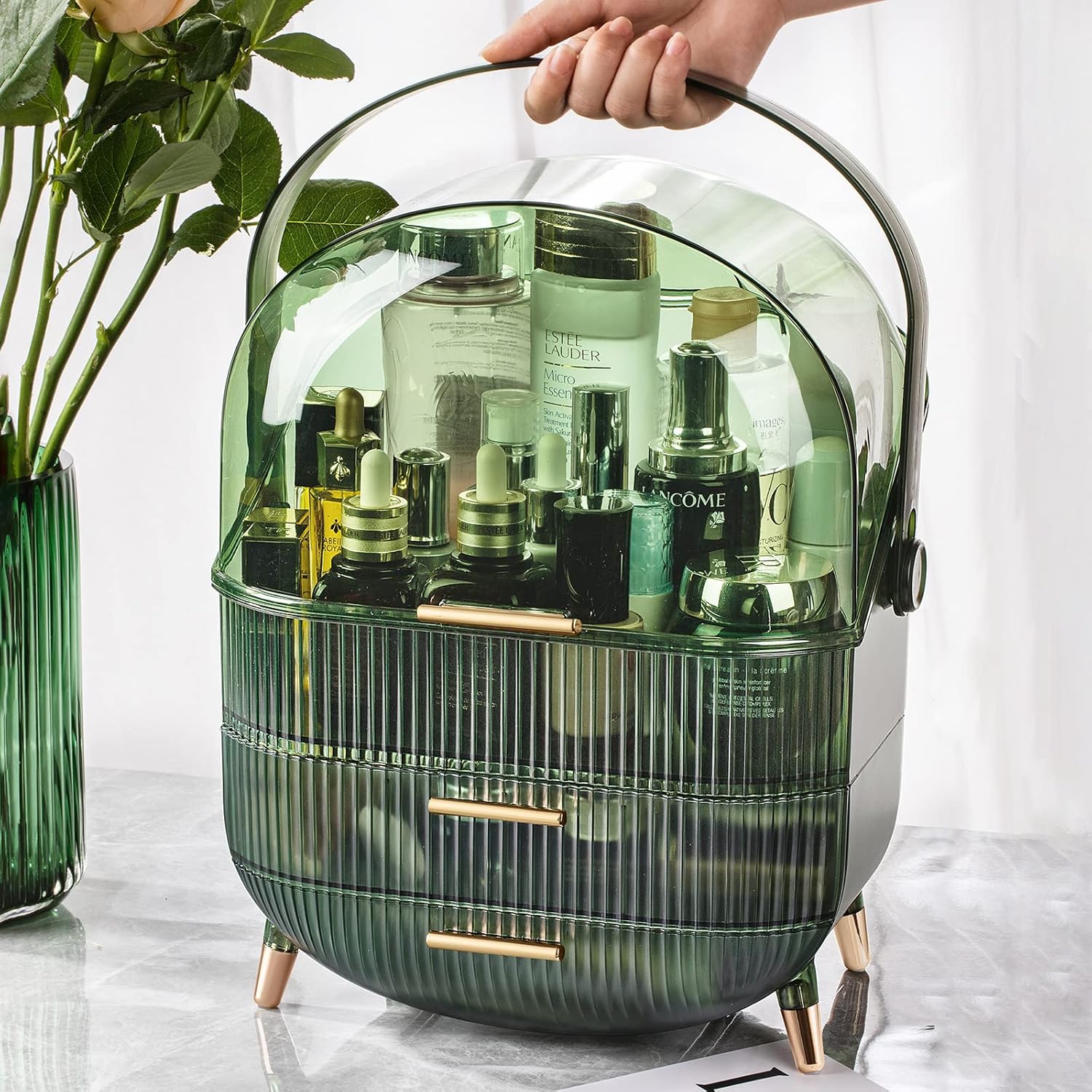 【Say Goodbye to Clutter and Make Life Easier】: The clear top cover keeps your cosmetics and skin care products away from dust and water stains and easy to clean, allowing you to see at a glance what you need to use and get it conveniently and quickly. Suitable for bathroom counter, vanity countertop, bedroom, desk, dressing room, dormitory, a change from a messy look. With portable handle, you can move your makeup space anywhere you want to use it, and take it with you when you travel.