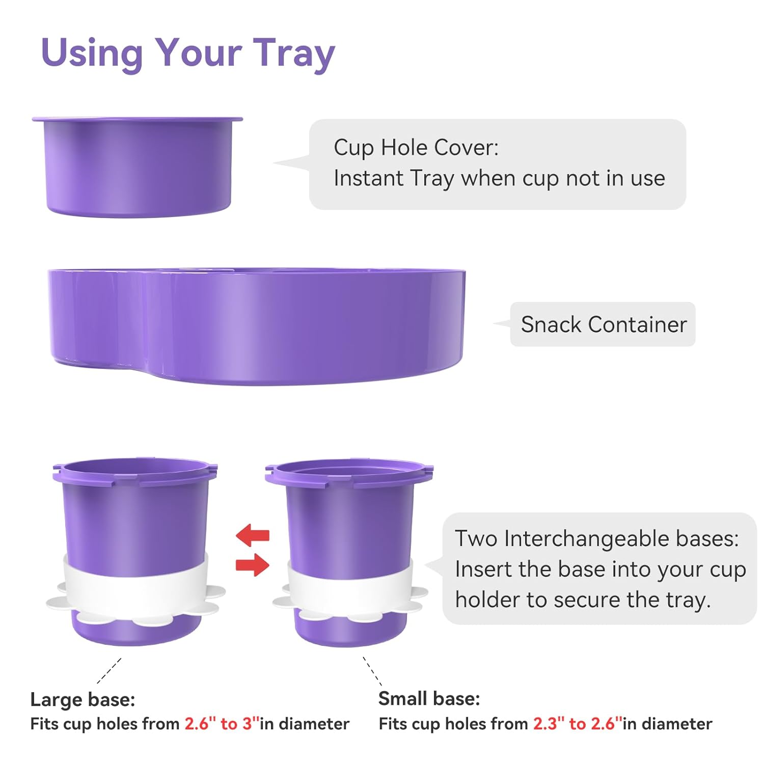 Flexible Fit: Two Bases for Most Cup Hole! Our car seat tray includes two interchangeable bases for added versatility. The small base fits cup holes with a diameter of 2.3’’ to 2.6’’, while the large base fits 2.6’’ to 3’’ cup holes. We also include two silicone bands for a perfect fit, ensuring a tight installation.