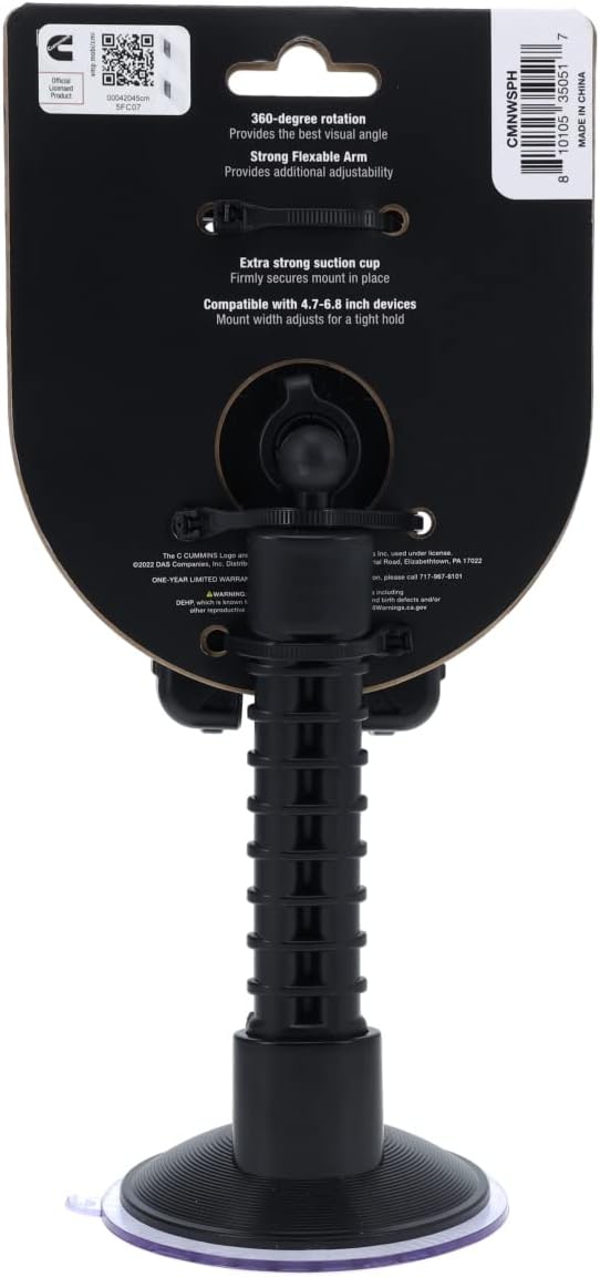 This is a great truck accessory for diesel fans. This Cummins windshield phone mount is compatible with any device that is 4.7-6.8 inches wide. The extra strong suction cup is guaranteed to keep your phone securely in place while easily rotating 360 degrees to get the best visual angle for driver or passenger view. The phone holder clips are tension activated for easy insert and secure hold while traveling. The arms close automatically to hold your device securely while you drive. Mount or remove your phone in just seconds. The universal fit makes it ideal for truckers and travelers looking for a phone holder that works with their windshield and their Apple or Samsung and other devices. You will be able to adjust the view to your preference because the arm is flexible. (Any passenger also can flex the arm of this windshield mount to face the passenger side as well.) The textured bottom of the phone cradle adds stability. Durable design is ready for travel. Cummins official licensed product.