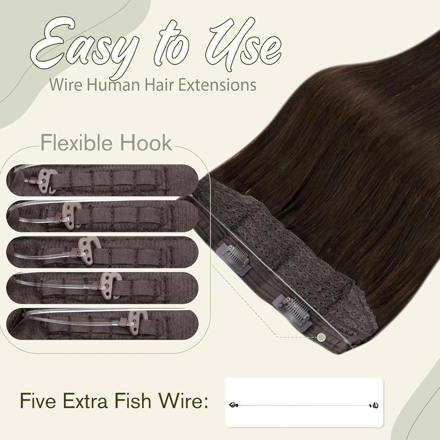 Easyouth Silky Wire Hair Extensions Dark Brown Human Hair Wire Hair Extensions Secret Wire Hairpiece Human Hair with Transparent Headband #2 Darkest Brown 16 inch 80g