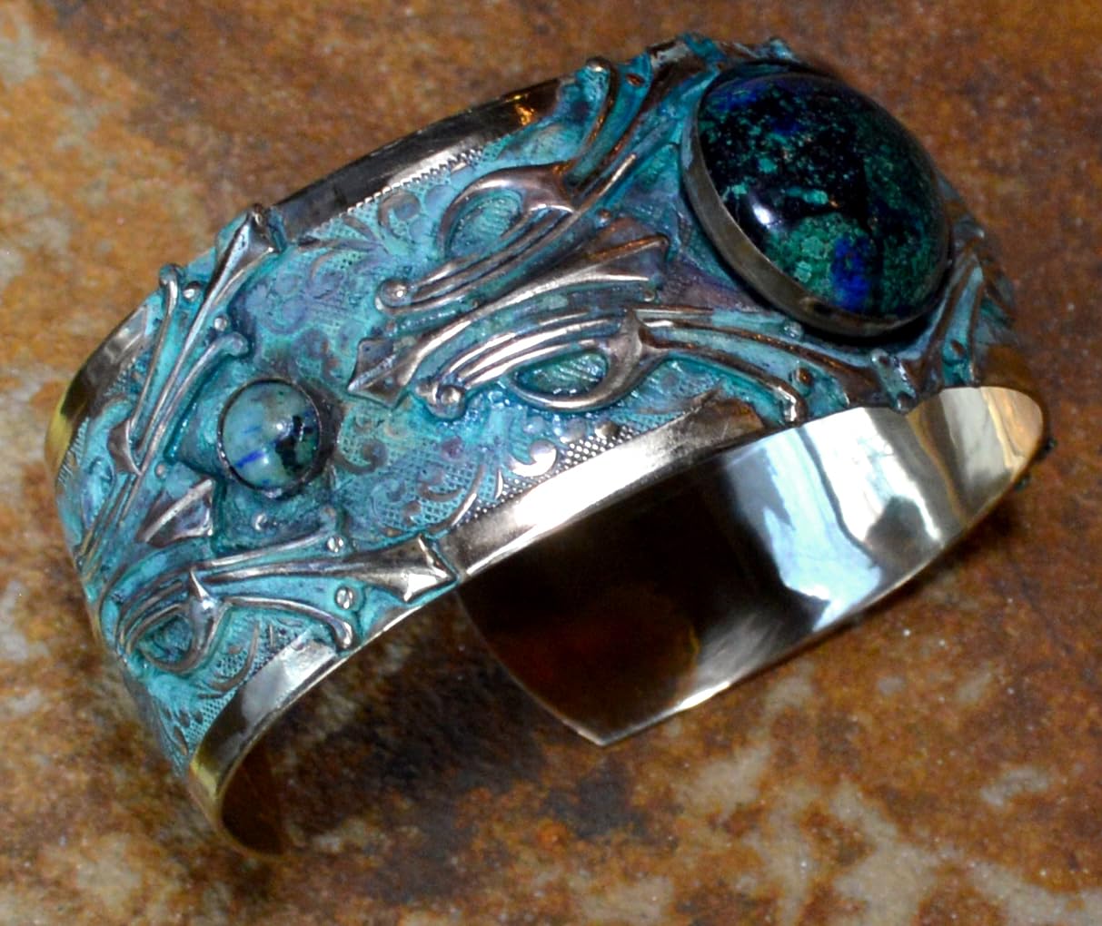 Elaine Coyne Collectible Wearable Artwear – Cuff Bracelet for Women, Handmade Stone Bracelets, Patina Art Deco Jewelry Gift Bracelet for Wife, Mom & Grandma, Brass Wrist Cuff Bracelet – Chrysocolla