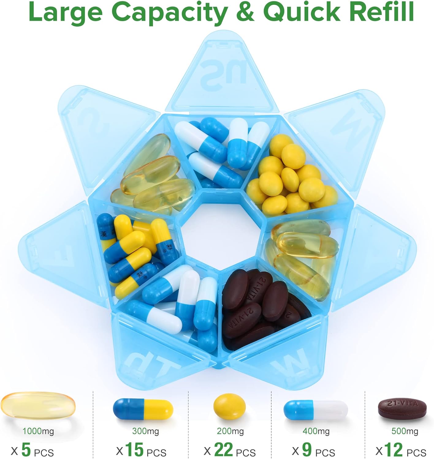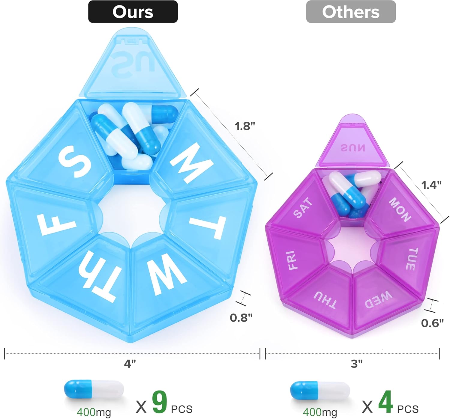 Larger Size and Larger Capacity: Compared with other similar pill case, our pill case’s size is more larger, this mean it can hold more daily pills, each compartment can hold up to 5 fish oils or 15 capsules.