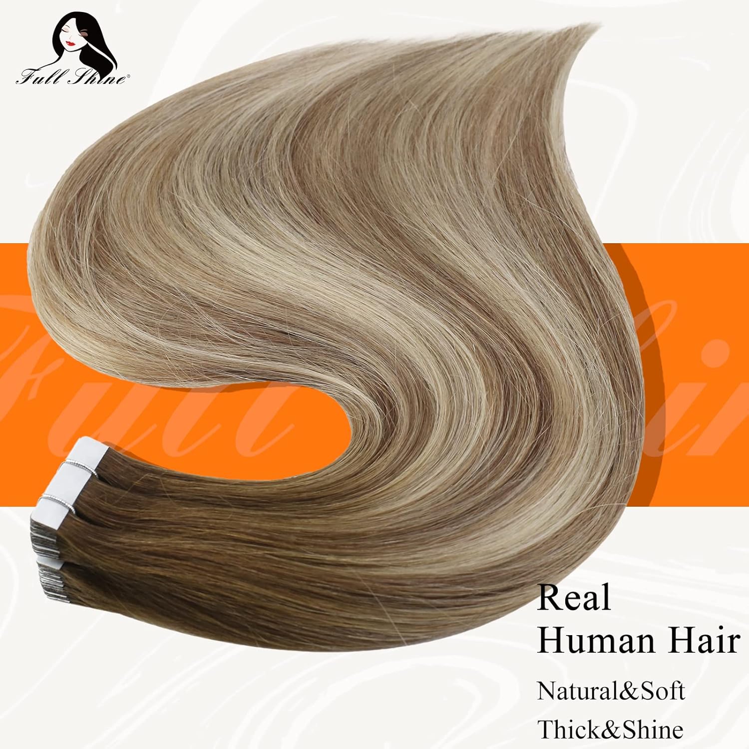 Full Shine Human Hair Tape in Hair Extensions Ombre Brown to Blonde Hair Extensions 22 Inch Shadow Roots to Middle Blonde Balayage Tape in Extensions Human Hair 20 Pcs 50g Double Side Tape ins 3/8/22