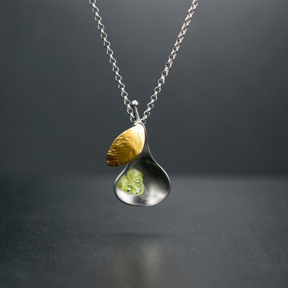 Totally handmade 925 solid sterling silver pear pendant. Rhodium & 24K gold plated with peridot stones on sterling chain in 2 different lengths.