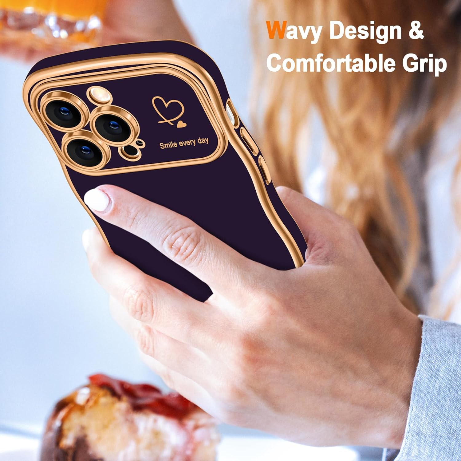 Hython for iPhone 14 Pro Max Case Cute Curly Wave Frame Shape Phone Cases, Thin Slim Luxury Plating Wavy Edge Soft TPU Bumper Shockproof Rubber Protective Cover for Women Girls, Love Heart-Dark Purple