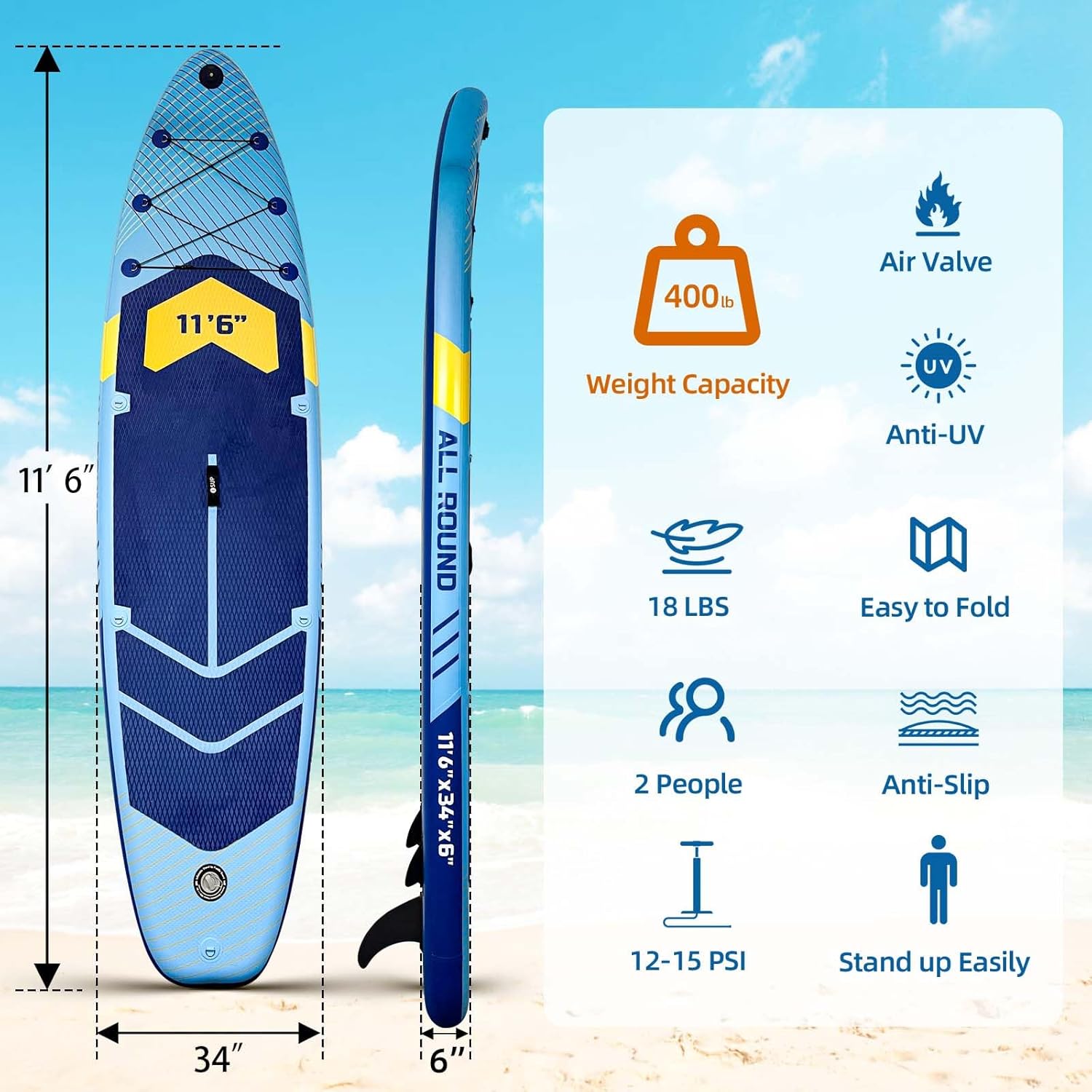 – Extra Wide Stability: Measuring 11’6″×34″×6″, this inflatable stand-up paddle board offers exceptional stability and balance, supporting up to 400 pounds. Ideal for all skill levels in oceans, lakes, and rivers