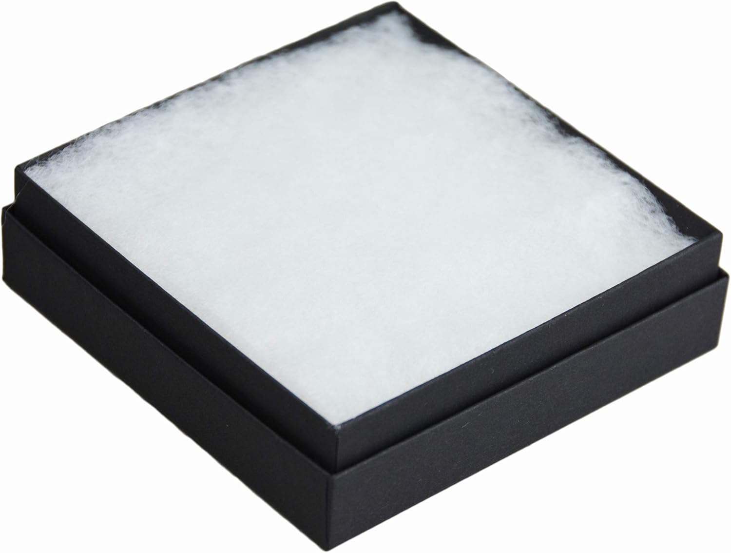 These matte black cotton filled jewelry boxes by JPB are perfect for storing and shipping your jewelry and gift products. Each box includes 100 individual 3 1/2″ x 3 1/2″ x 1″ boxes lined with a synthetic cotton filler that won’t snag on to your jewelry and will protect your products. Our boxes are manufactured with a thick and rigid cardboard that won’t crush or bend when stacked.
