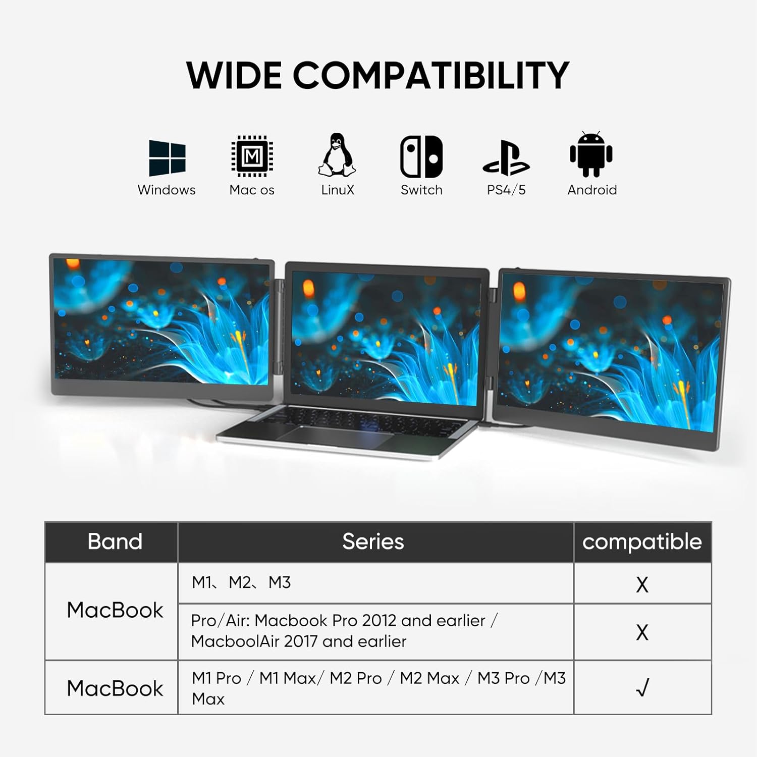 【Wide Compatibility & Easy to Connect】Our screen extender portable laptop is fully compatible with Windows/MacOS/Type-C phones/PS4/Xbox. It’s compatible with MacBooks equipped with M1/M2/M3 Pro or Max chips but does not work for the M1/M2/M3 chips. The package includes 2* HDMI, USB-A, and Type-C cables. There is no need for a driver to connect, plug and play. Whether you choose a USB-C or USB-A and HDMI port to connect, easy and simple.