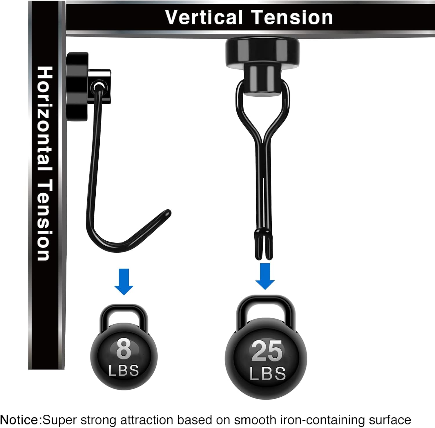 【STRONG MAGNETIC HOOKS】 The swivel magnet hooks for cruise cabin have 25lbs pull based on vertical direction. The tension of magnet hooks based on horizontal application are reduced by 2/3. Please note that the tension of the magnet with hooks are also affected by the material of the contact surface and other factors.