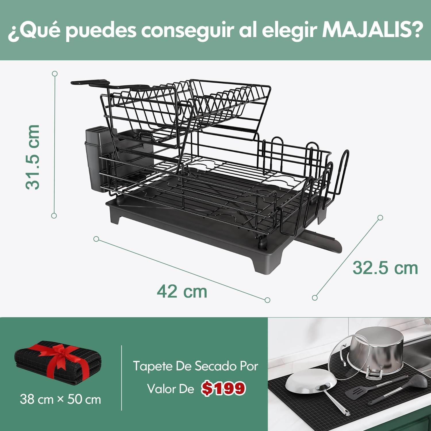 MAJALiS Dish Drying Rack for Kitchen Counter, Stainless Steel Large Dish Drainers Strainer with Drainboard Set for Sink, 2 Tier with Utensil Holder, Cups Holder,Extra Drying Mat, Black