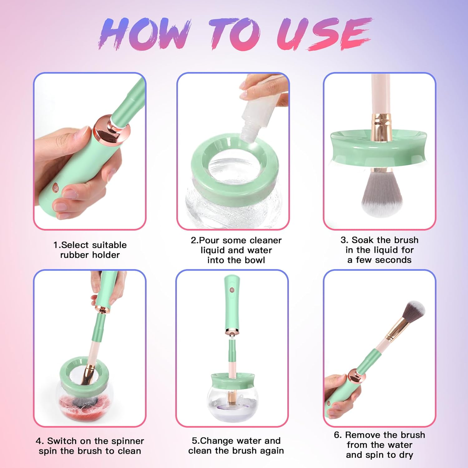 Easily Use Steps – 1. Choose the suitable rubber holder for a brush and attach it to the spinner. 2. Pour water and some cleaners into the bowl. 3. Dip into the liquid and spin to clean, raise up out of water and spin to dry.