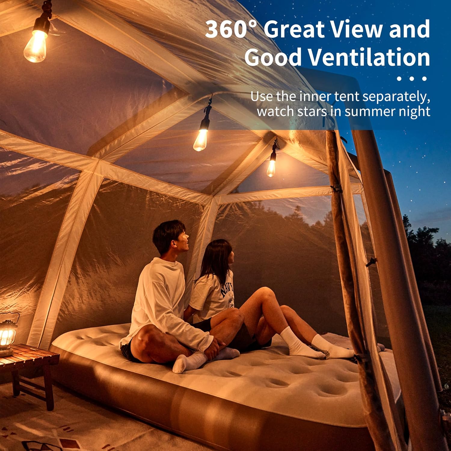 【Double Layered Tent】:this inflatable tent has inner tent and rain fly included, both can be used separately; when set up the tent fly alone, you can use it as a canopy tent or sun shelter, suitable for 6-8 person sitting inside with camping gears; The inner tent can be used as a screen house, you can watch stars in summer night.