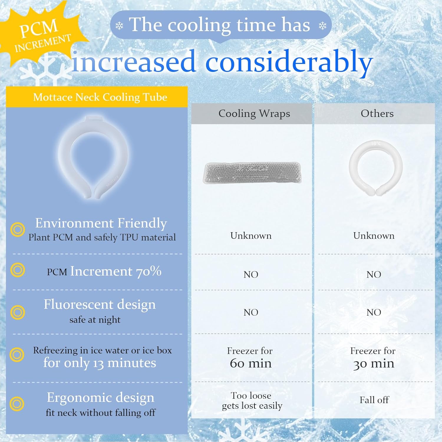 【NATURALLY FREEZE BELOW 64°F】Ice ring made of innovative liquid plant phase change material (PCM) to start freezing in environments below 18 ° C (64 ° F), which freezes faster and lasts longer than water, making neck cooling tube a must-have in hot summer.(Single-sided printing, Back fluorescent design)