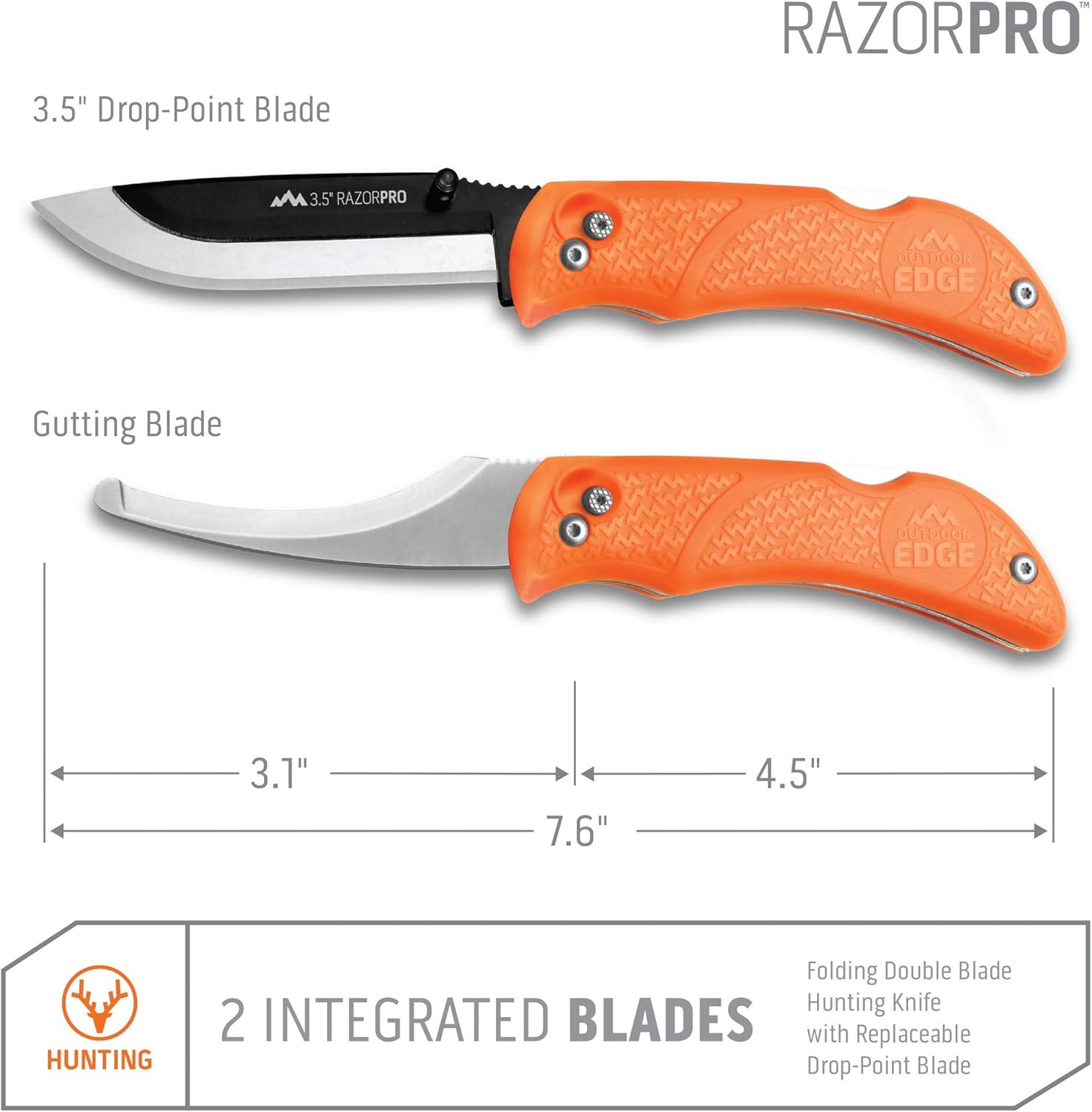 OUTDOOR EDGE RazorPro – Double Blade Folding Hunting Knife with Replaceable Razor Blade, Gutting Blade and Camo Nylon Sheath (Orange, 6 Blades)