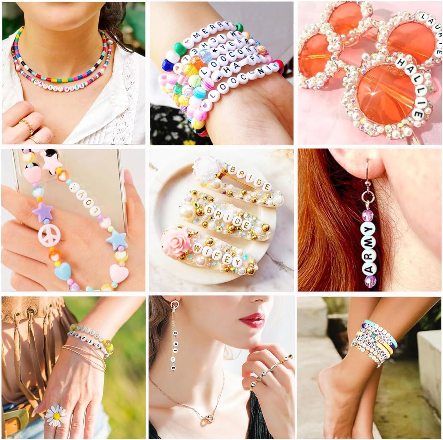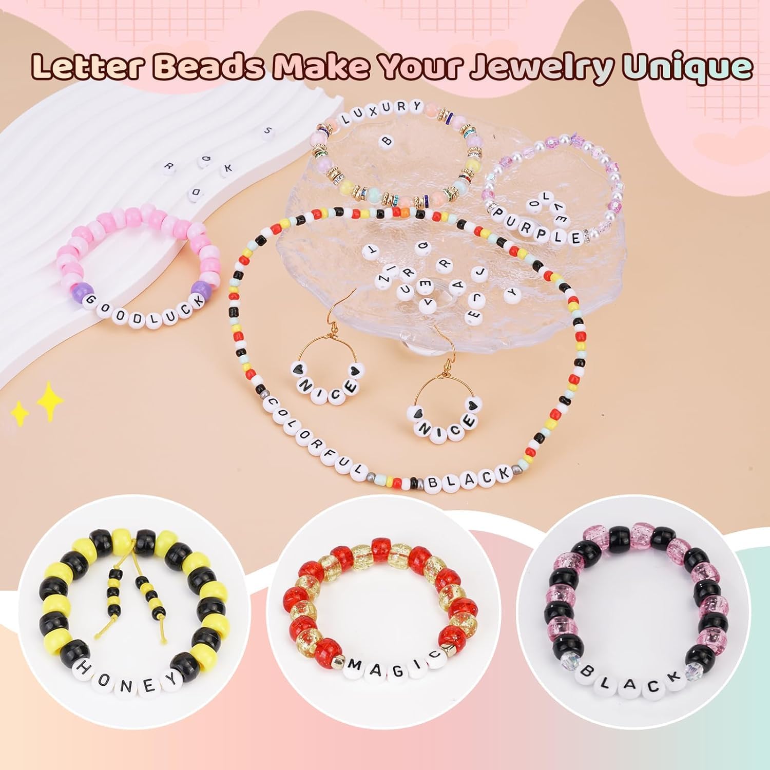 Large Quantity: Totally about 2400pcs, include 2080pcs letter beads (80pcs for each 26 letters A~Z) , 320pcs other 4 style beads showed in the picture (each style 80 pcs), 1roll 10m elastic string.
