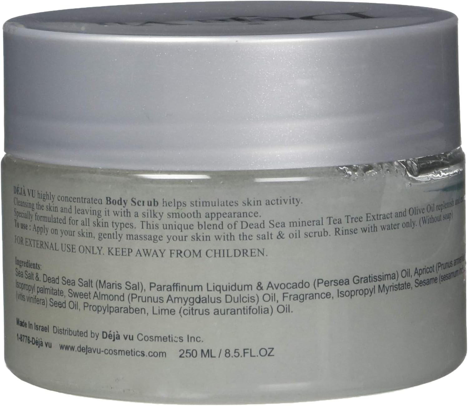 Features . Your skin has a remarkable ability to rejuvenate itself from daily stress, but there are times that it may not be able to efficiently maintain its healthy glow and youthful appearance. Deja vu highly concentrated body scrub uniquely assists your skin’s natural ability to heal and rejuvenate itself. By stimulating epidermal activity, your skin’s natural desire to remain supple and playful ushers in its natural self-healing processes. Exfoliating damaged skin cells has been known to signal your skin to begin its life long desire to present itself as healthy and radiant. Overlooking the practice of aiding your skin’s healthy desires may allow unwanted blemishes and result in your skin looking permanently tired and worn. It is important to instill the habit of actively caring and pampering your skin so that you may confidently display your success at living a healthy and invigorating lifestyle. For best use, gently massage your skin with Deja vu Body Scrub then rinse with water only. A tran quil mood will wash over your soul as your muscles and outer being embrace the habit of living healthy and well.