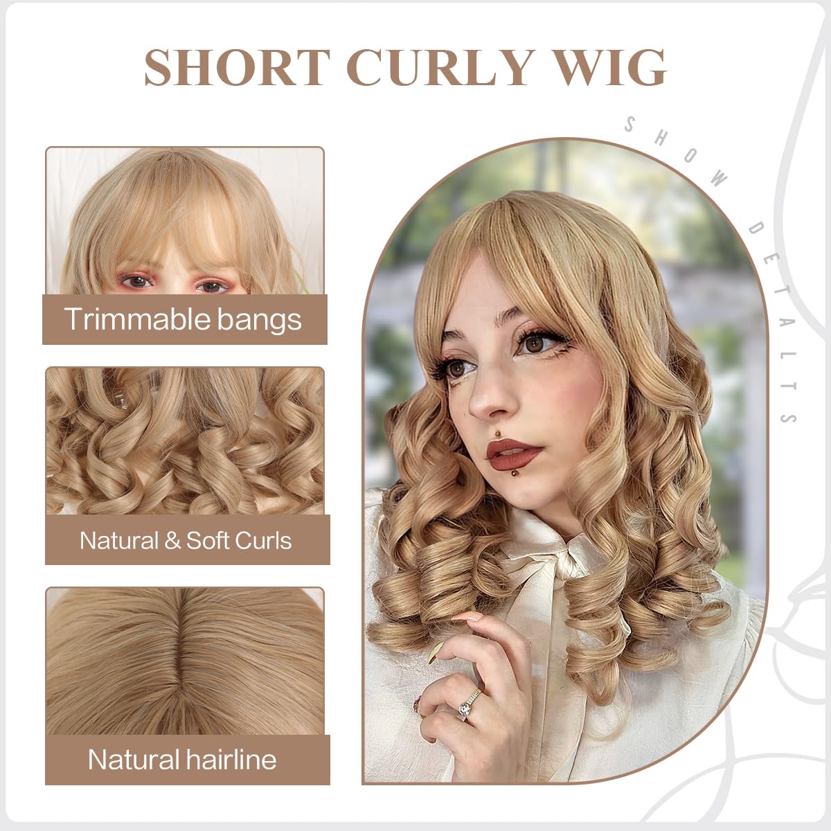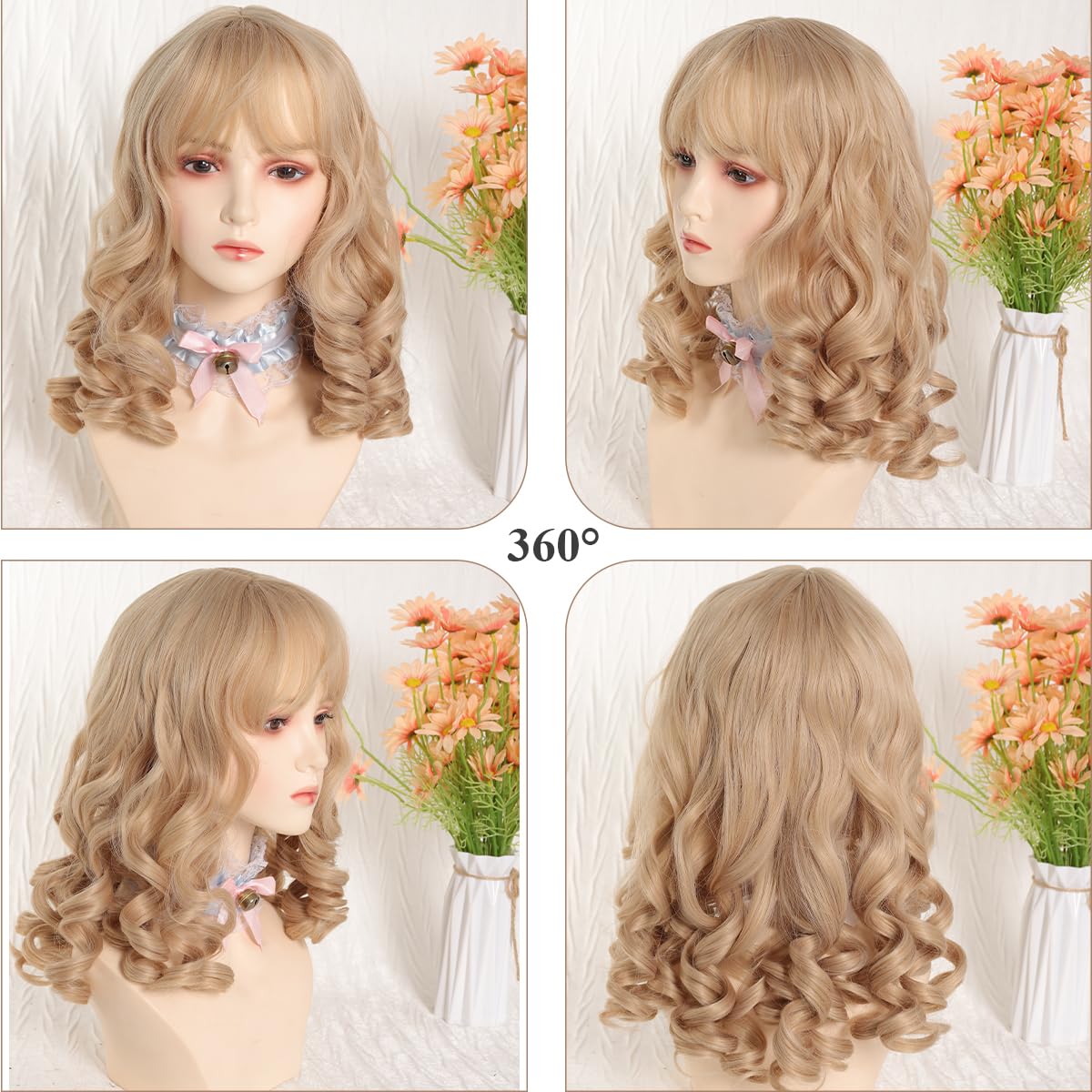Short Curly wig Retro Roman Curly Wig with Bangs Cute Lolita Wig Women Halloween Cosplay Wig Princess Curly Wig(linen brown)