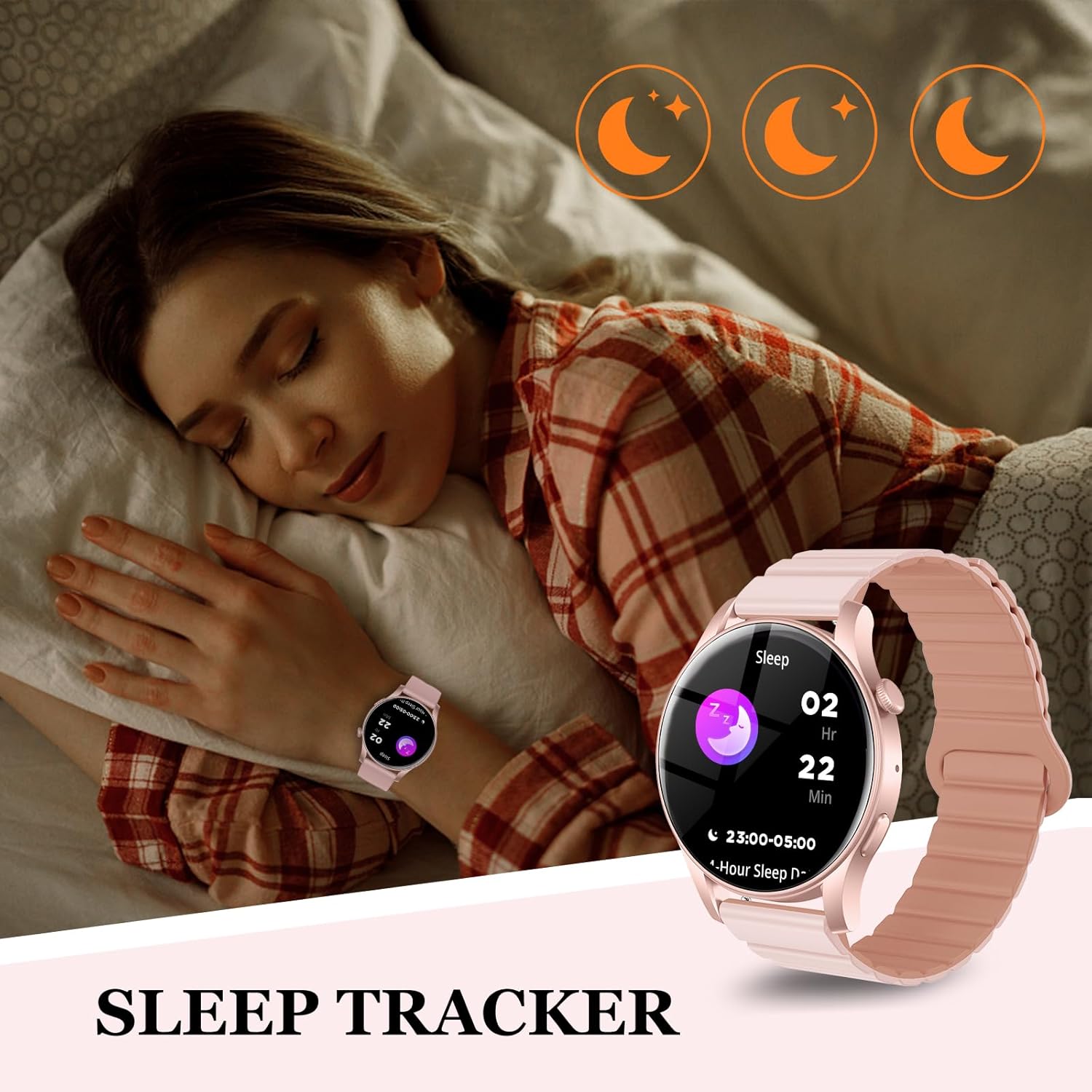 【Focus On Your Health】Built-in high-precision PPG optical sensor, this ladies smart watches realizes truly comprehensive health protection, supports 24/7 heart rate monitoring, blood pressure blood oxygen monitoring. The sleep tracker can automatically monitor your sleep status and provides comprehensive analysis of sleep quality (deep sleep, light sleep and wakefulness) (Note: This data is for reference only and is not intended for medical reference)