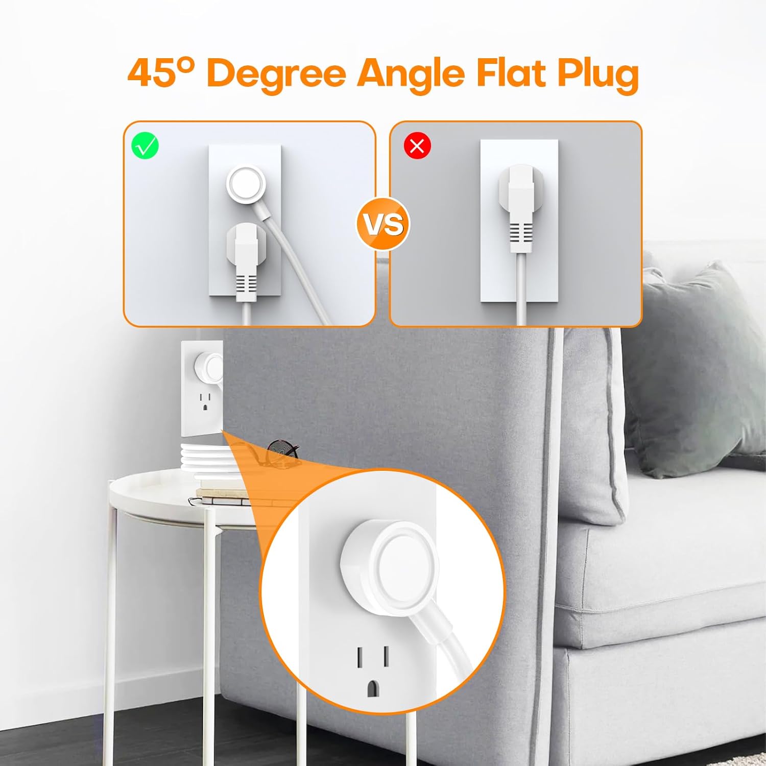 45-degree Right Angled Design – The flat plug surge protector 45-degree right-angled will not block the bottom receptacle of your duplex wall outlet and frees up the receptacles for other uses.Space Saving Flat Plug – With only 0.48 inch ultra slim design, this surge protector power strip has a flat plug in real sense, which can close to the wall easily, and hide in the back of furniture, bed or refrigerator.