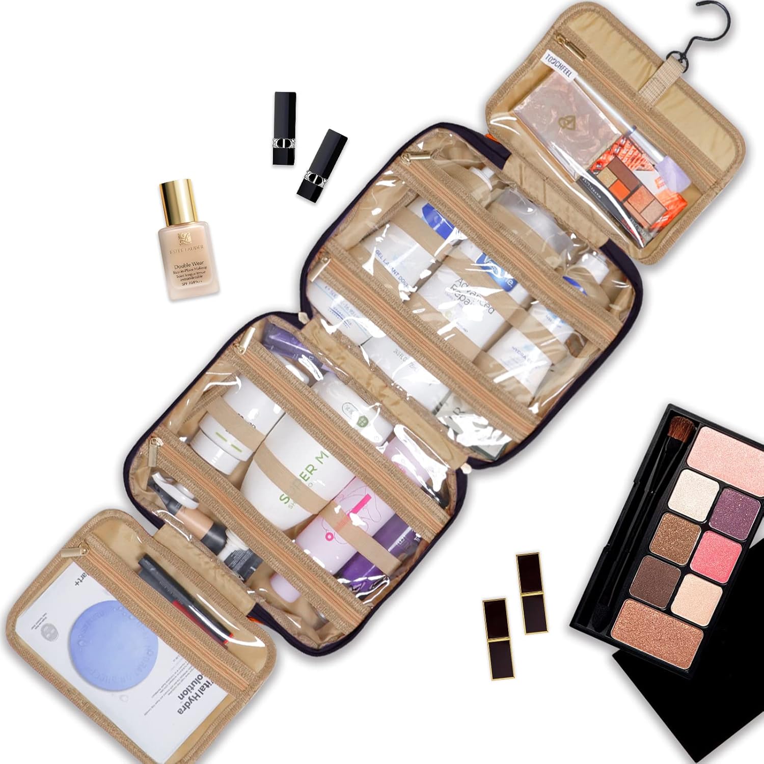 【EASY TO GRAB】Special U-shape zippers design, take out the toiletries or zip up the toiletry bag quickly. Multiple pouches and elastic bands. 360°metal hook gives you a variety of hanging options.