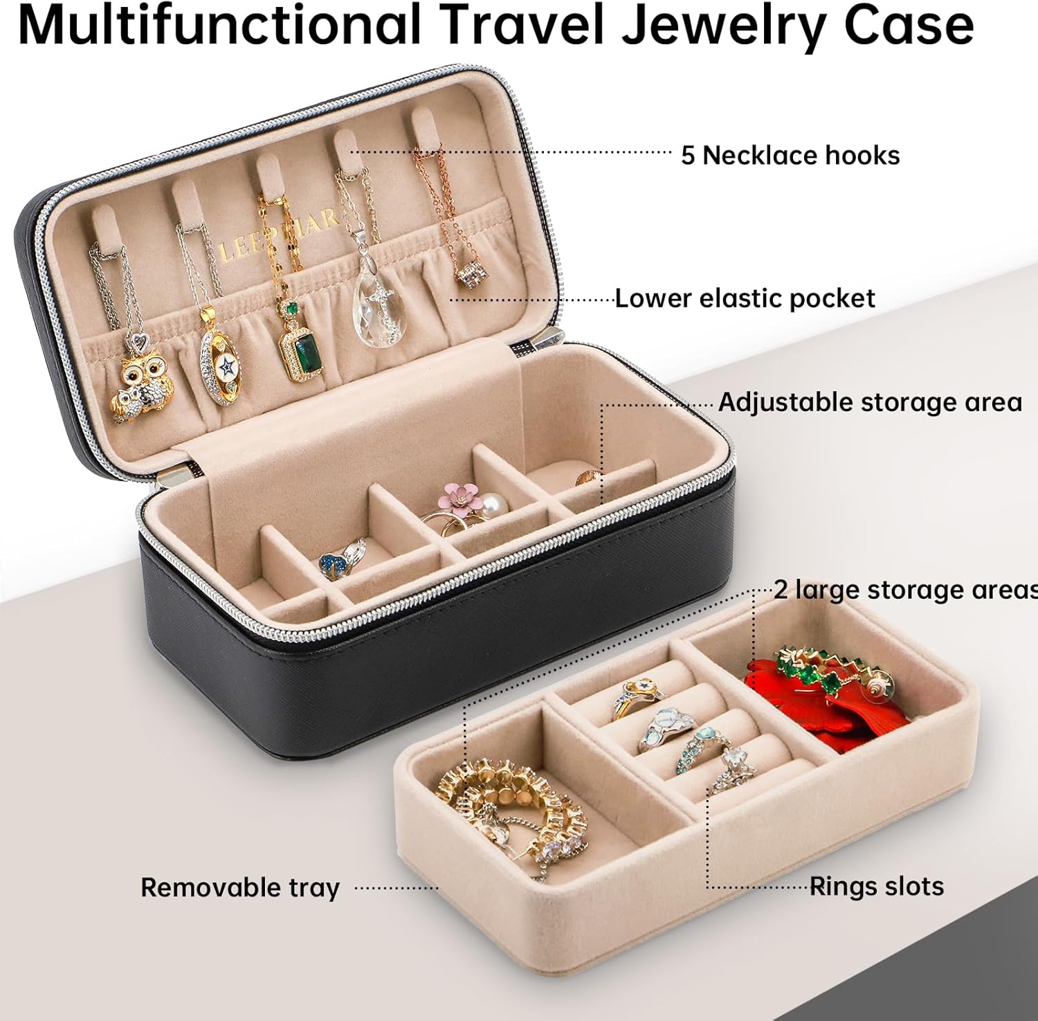 Multi-Functional Travel Jewelry Case: The interior of the jewelry storage box is a double-layer structure. The top part is wrapped with 5 hooks and the lower elastic pocket, which can perfectly fix the necklace and bracelet without messing up. The middle is a removable tray with a ring storage area And an area for items like chains, rings, bracelets, earrings, pendants, the dividers in the bottom 8 compartment section are removable, allowing you to keep your existing studs and other bulky jewelry free.