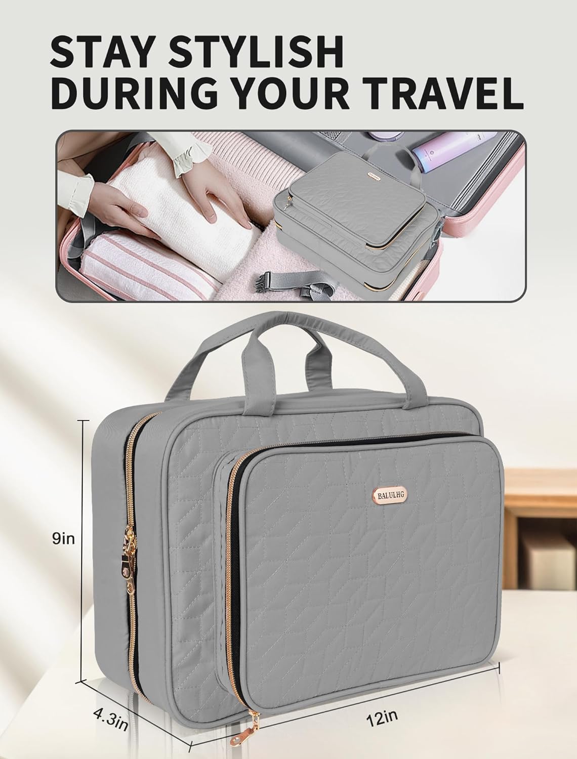 Travel Toiletry Bag for Women Large Capacity with Hook – Portable Cosmetic Case,Hanging Makeup Bag for Full Sized Toiletries,Travel Essentials for Business Trips and Camping,Grey