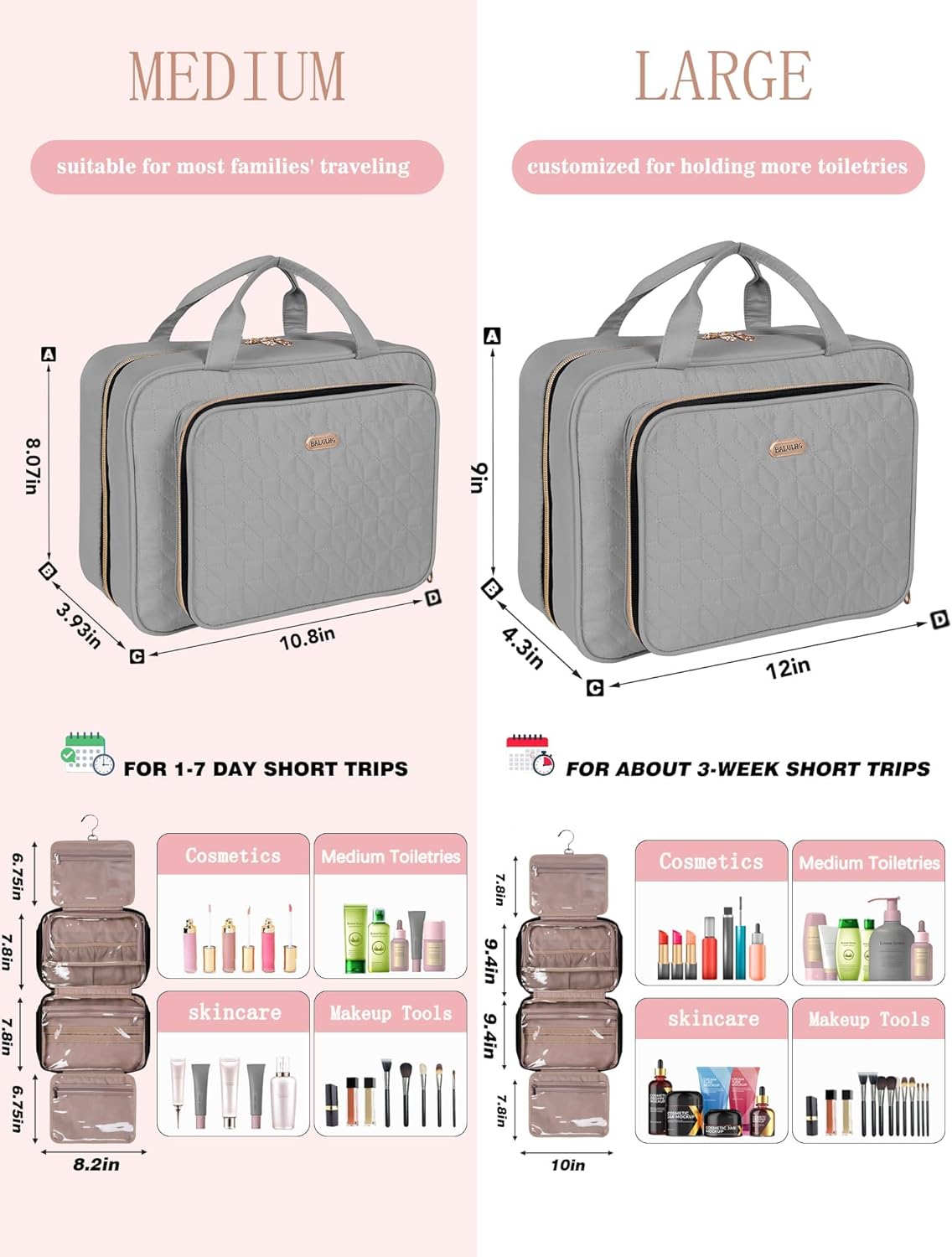Large enough for packing and keeps good shape, buit-in hook allows hanging the toiletry kit from towel rack, coat hook or wherever is available, making your toiletries and cosmetics displayed well for easy access and saves counter space as well. just enjoy your romantic holidays!