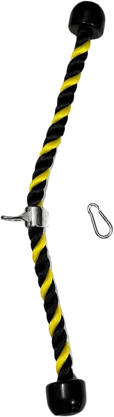 Constructed of heavy-duty black and red nylon braided rope, coated rope makes it more wear-resisting, and please use it with workout gloves if it is rough for you.The rubber handles are big enough to keep your hands from slipping off, and the end is reinforced by screw to make sure it is sturdy and more durable.Free Moving Connection: the metal connection part is not attached to the rope and is free moving, it can be used in a flexible way.Packaging includes: 1 x Tricep Rope + 1 snap hook.