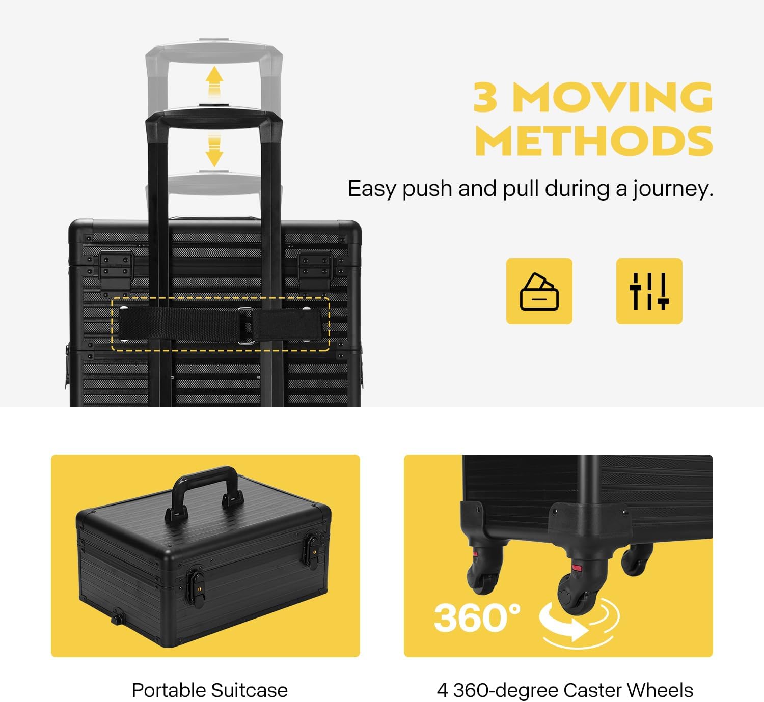 LARGE CAPACITY – With a loading capacity of 55 lbs. and dimensions of 13.9″(L) × 9.9″(W) × 28.7″(H), this rolling makeup case provides ample storage for cosmetics and tools such as makeup brush sets, spray bottles, and hair dryers; The bottom layer has a large storage space with no divider that can accommodate makeup tools of large sizes