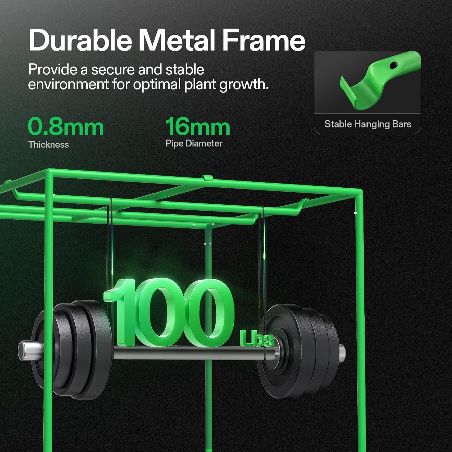 Sturdy Build & Extra-Thick Materials: The indoor tent features robust metal poles, top bars, and tool-free corner connectors, securing the structure; The top bar supports up to 100 lbs., meeting various equipment needs; Made from premium 340g high-density fabric, the tent is waterproof, tear-resistant, and double-stitched for excellent light blockage; The inside lining designed with PE lining and Mylar walls, ensures a safer environment for your plants