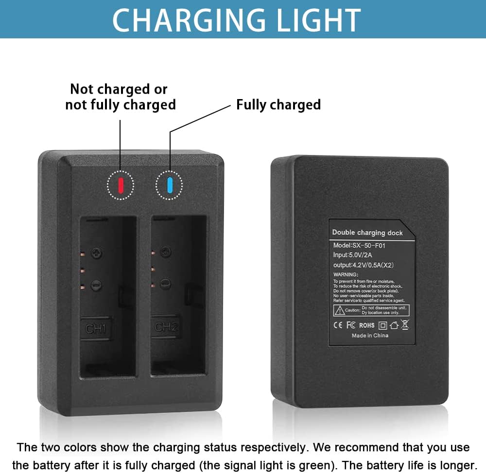 【Indicator light】: There is LED light on the charger to display the battery level. Green represents that the battery is fully charged, and red represents that the battery is not fully charged or there is no battery in the charging slot.