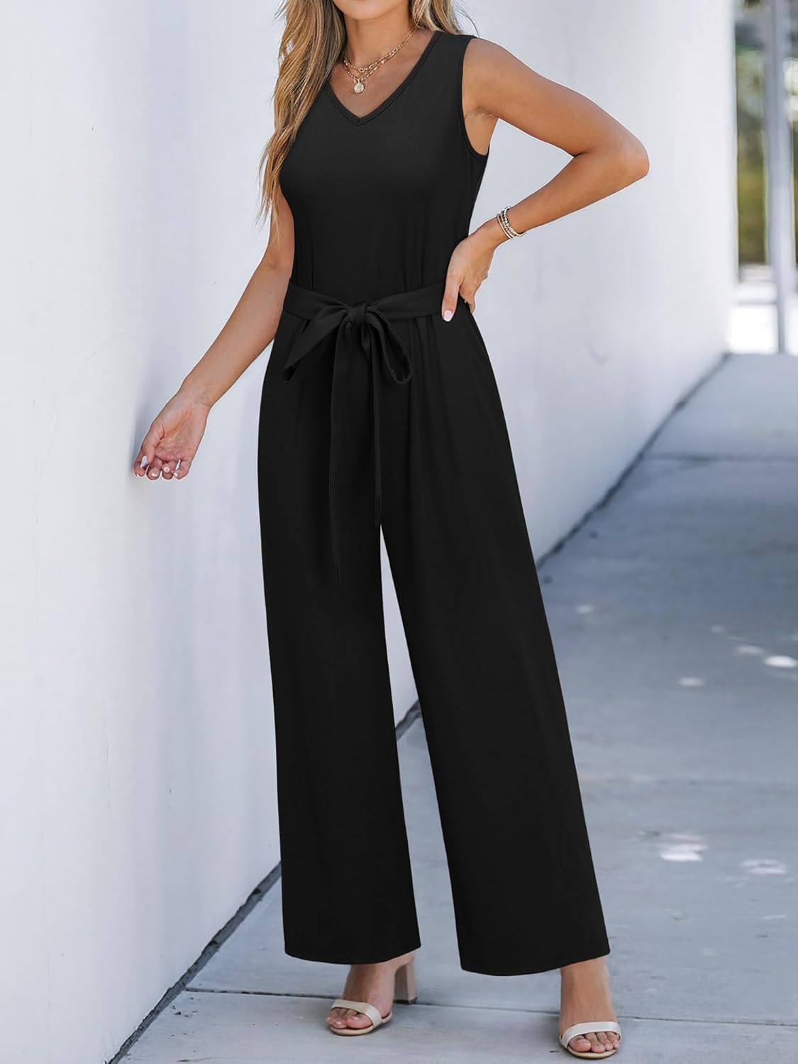 Womens V Neck Wide Leg Belted Jumpsuits with Pockets Sleeveless Tie Front Jumpsuit Tank Tops Wrap Drawstring Waist Rompers