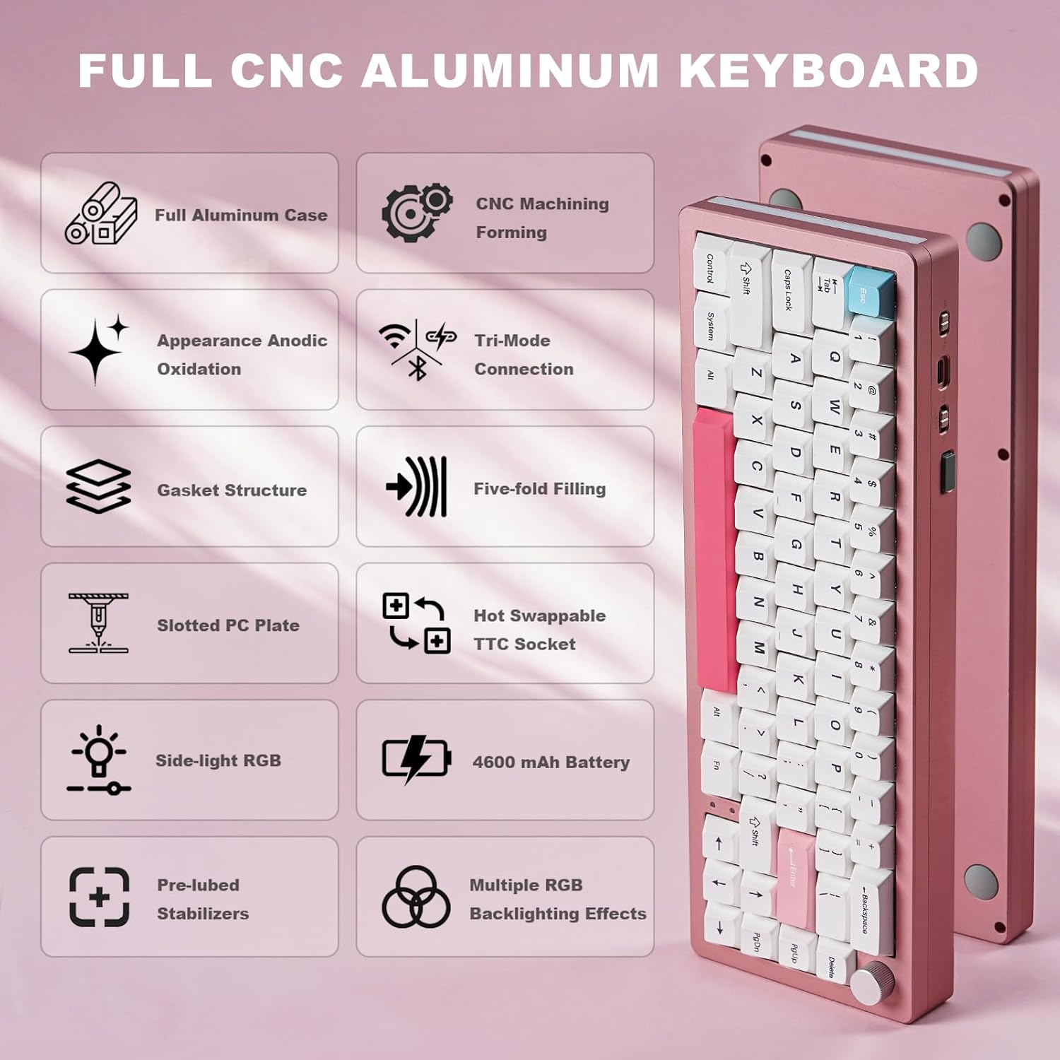 YUNZII AL66 Wireless Mechanical Keyboard,65% Knob Control Aluminum Gaming Keyboard BT/2.4G/Wired Hot Swappable Pre-lubed Switches, Gasket Mounted RGB Keyboard for Win/Mac(Milk Switch, Pink)